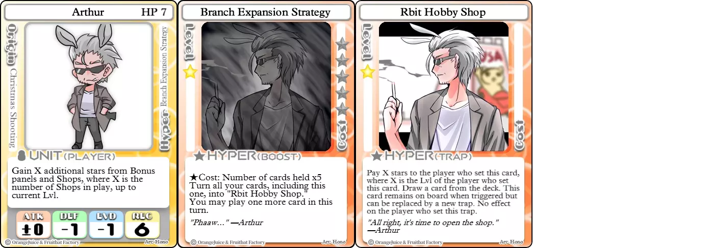 “为了我的玩具店的未来!” 难度:★★☆☆☆ 职业:和平主义者 标签:收藏家/陷阱师/辅助 优势:生命值高,可建立强大的被动星星生成机制 劣势:承受大量伤害,高度依赖特定条件,商店会被陷阱摧毁 亚瑟是一名体型庞大的角色,拥有独特的星星收集方式。通过使用其奥义【分店扩张策略】放置商店,亚瑟会随时间获得更多星星,当对手踩中商店时还会获得少量爆发星星。结合其高生命值,一旦亚瑟完成部署,其他角色将很难击败他。不过他也存在一些弱点,尽管生命值高,但由于防御属性较低,在战斗中会承受大量伤害。他的商店可以被陷阱卡覆盖,而商店本身会帮助更快从牌组中抽出这些陷阱卡。【星光爆破】通过消灭他所有的商店,几乎能将他从游戏中彻底移除。最后,他非常依赖爆发,并且每次建造更多商店时都会牺牲手牌,导致他在抽到更多卡牌前缺乏防御或治疗手段。