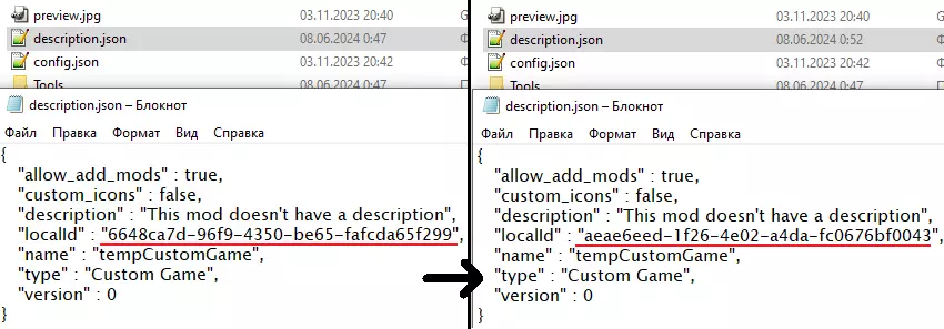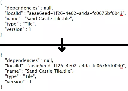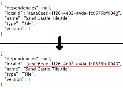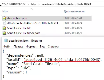 打开“description.json”。将用户游戏的localId替换为初始的磁贴UUID(来自第1.2步)。