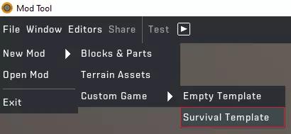 1.5. 创建自定义游戏生存模板 在Mod工具中,依次进入文件>新建Mod>自定义游戏>生存模板。 此自定义游戏为临时游戏,用于在 tiles 编辑器中获取图纸。