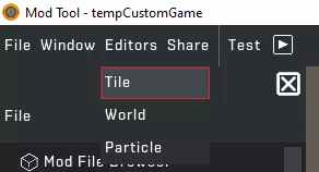 2.5. 创意工坊的方块和部件 模组方块应能正常工作,但不会显示在瓷砖编辑器中。您可以按照1.8的方法添加它们。 3. 瓷砖编辑器 3.1. 在Mod Tool中打开瓷砖编辑器 在Mod Tool中,进入Editors > Tile