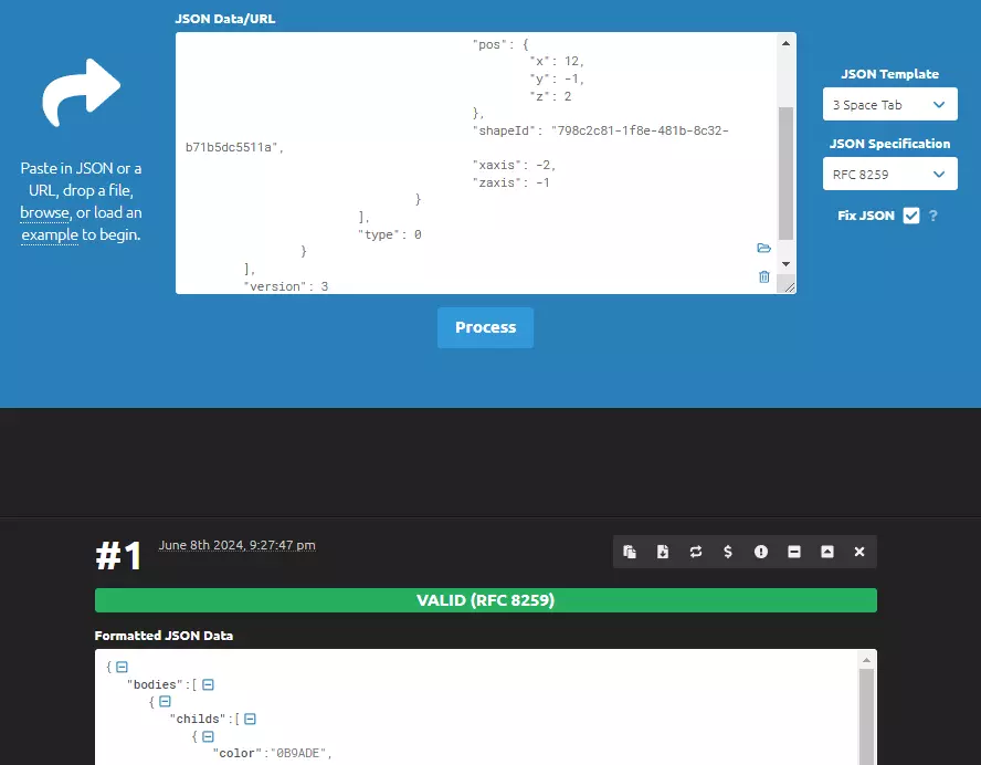 如何在Windows 10中显示文件扩展名: 1. 打开文件资源管理器,切换到“查看”选项卡。 2. 勾选“文件扩展名”旁边的复选框。 遗憾的是,如果您使用的是在《电梯》中保存的图纸,在编辑器中不借助网格将无法更改其旋转角度或位置。即使您修改了对象属性,且该对象在 tiles 编辑器中显示正常,创建世界时图纸仍会损坏。 要解决此问题并使旋转和位置更加灵活,您可以编辑图纸。为了方便编辑图纸,您可以借助 json 格式化工具让图纸更易读。作为示例,我们将查看一个包含多个物体和方块的图纸。简单来说,在建筑中有一些物体:轮子、门等。每个物体包含多个方块。为了能在瓷砖编辑器中自由移动和旋转对象,需要在每个物体的末尾添加参数【type】:0。