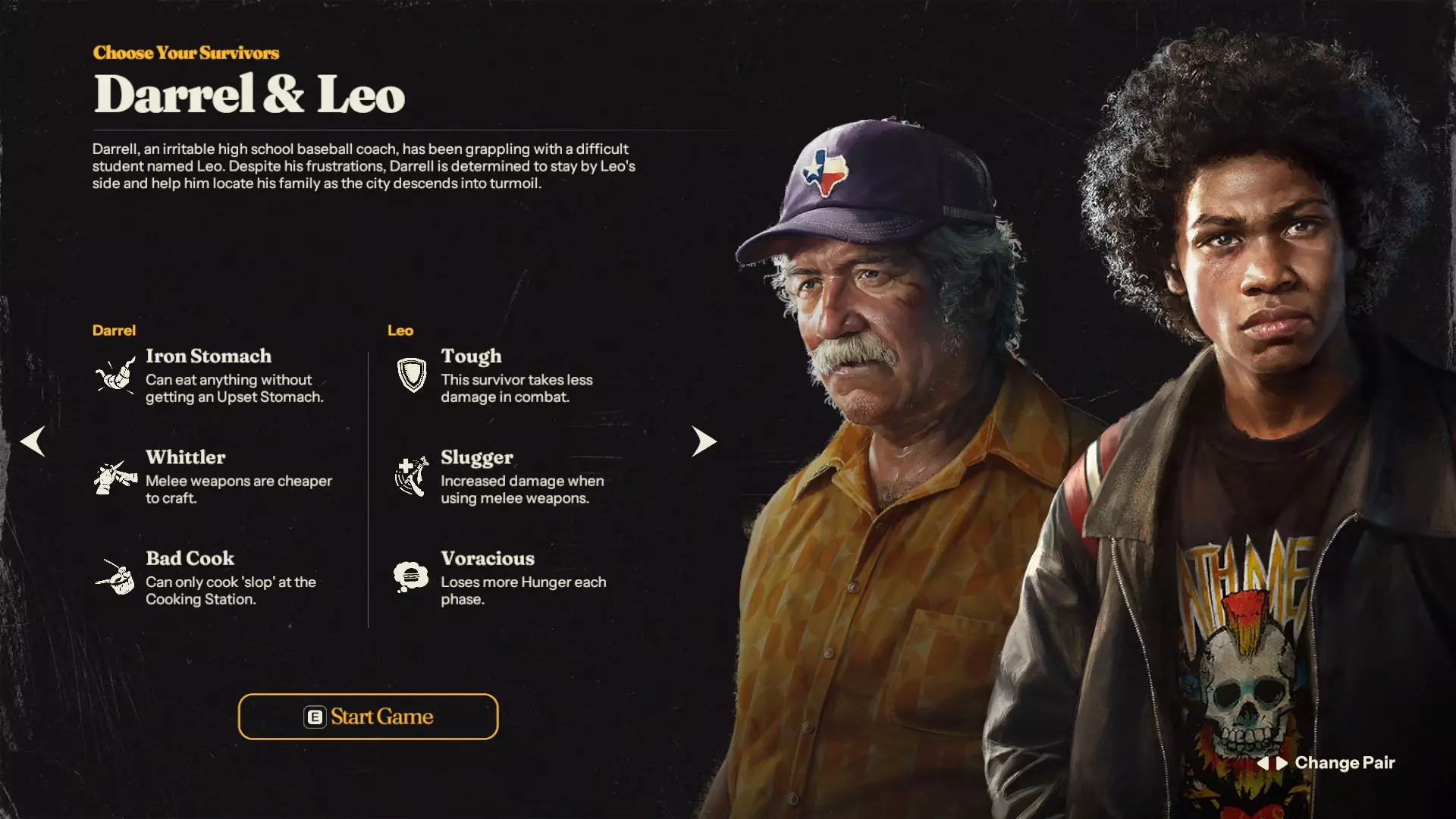 达雷尔: 铁胃:可以吃任何东西而不引起胃部不适 削木者:制作近战武器成本更低 蹩脚厨师:只能在烹饪站制作糊状物 评级:A+ 类型:基地型 利奥: 坚韧:该幸存者在战斗中受到的伤害减少 猛击者:使用近战武器时伤害增加 贪吃:每阶段失去更多饥饿值 评级:S级 类型:拾荒者 战斗/拾荒:5/5★ 制作/基地:3.5/5★ 维护:1.5/5★ 协同:4/5★ 达雷尔和利奥之间具有协同作用,达雷尔是一名还不错的基地/制作型幸存者,可以为利奥制作近战武器,而利奥的战斗能力与佩妮不相上下。这对组合的问题在于需要招募弗兰克来获得一名优秀的厨师,以满足利奥更高的饥饿需求。考虑到这一切,这仍然是其中一个新手最佳初始搭档,但老手很可能会选择其他组合。 新手评级:A级 老手评级:B级 塞巴斯蒂安+黛安