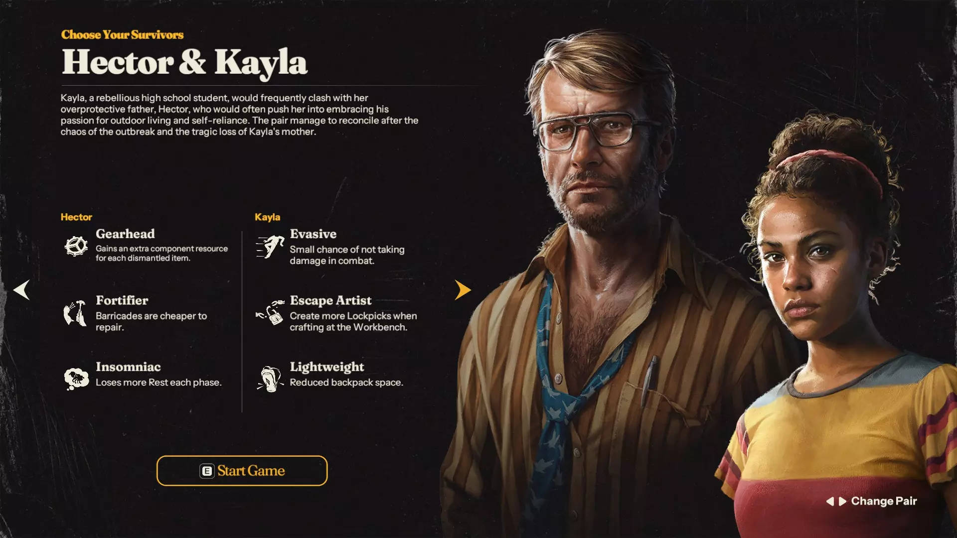 赫克托: 【机械迷】拆解每个物品时额外获得一个零件 【强化者】 barricade维修成本降低 【失眠症患者】每个阶段失去更多休息值 评级:S+ 类型:基础 凯拉: 【闪避】战斗中有小概率不受伤害 【逃脱大师】在工作台制作时产出更多开锁器 【轻装】背包空间减少 评级:C 类型:基础 战斗/搜刮:1/5★ 制作/基地:5/5★ 维护:2/5★ 协同:0/5★ 赫克托和凯拉存在一个问题;在这个初始二人组中,凯拉几乎形同虚设。她拥有一个顶级的搜刮正面特质和一个使其正面特质失效的负面特质,而且她的制作技能也是第二无用的制作技能,这使得赫克托必须外出搜刮,直到找到一个搜刮者幸存者来接替她的位置。但如果你成功做到这一点,这个初始双人组合会变得非常强力,因为赫克托是游戏中最优秀的工匠之一。新手绝对不应该选择这个组合,而应坚持更好的选择,但老手通常会纯粹因为赫克托而选择它,并且忽略与凯拉搭档。新手评级:C级 老手评级:S级 特蕾西+韦恩