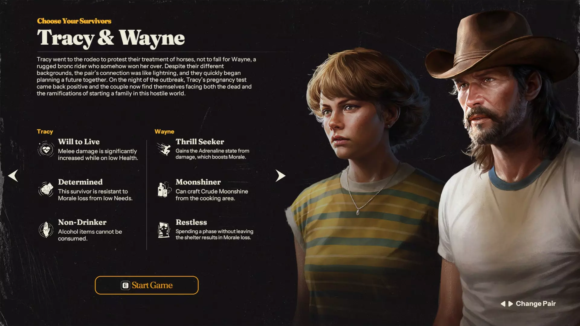 特蕾西: 求生意志:低生命值时近战伤害提升 坚定:该幸存者对因需求值低导致的士气损失具有抗性 滴酒不沾:无法饮用酒精类物品 评级:C级 类型:混合型 韦恩: 寻求刺激:受到伤害时获得肾上腺素状态,该状态可提升士气 私酒酿造者:可在烹饪区酿造粗制 moonshine 坐立不安:一回合未离开避难所会导致士气损失 评级:C级 类型:拾荒者 战斗/拾荒:2.5/5★ 制作/基地:2.5/5★ 维护:2.5/5★ 协同:0/5★ 特蕾西和韦恩算是还不错的幸存者,但也仅此而已,他们只是还不错。这两名幸存者没有真正的优势,也没有明显的劣势,但与其他初始双人组合相比,他们没有任何竞争力,不值得选用。新手评级:D级 老手评级:D级 更新日志 - 指南更新 18.04.25【热修复v0.3.3 - 战利品、近战武器及潜行击杀噪音】 【佩妮】:从S级调整为S-级,原因是潜行击杀的噪音现在降低50%,导致其特性效果减弱 【达雷尔】:从A级调整为A+级,原因是近战武器的制作成本增加且世界中可找到的近战武器减少 【赫克托】:从S级调整为S+级,原因是制作近战武器需要更多材料,使得他的拆解能力更加重要 总结