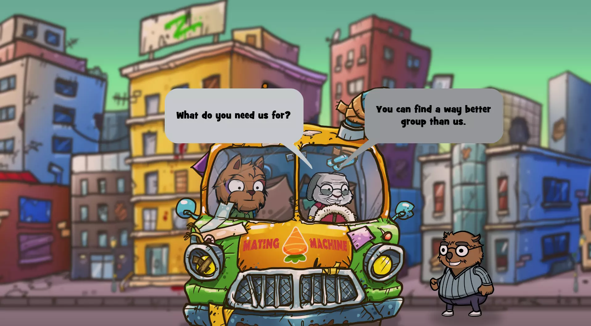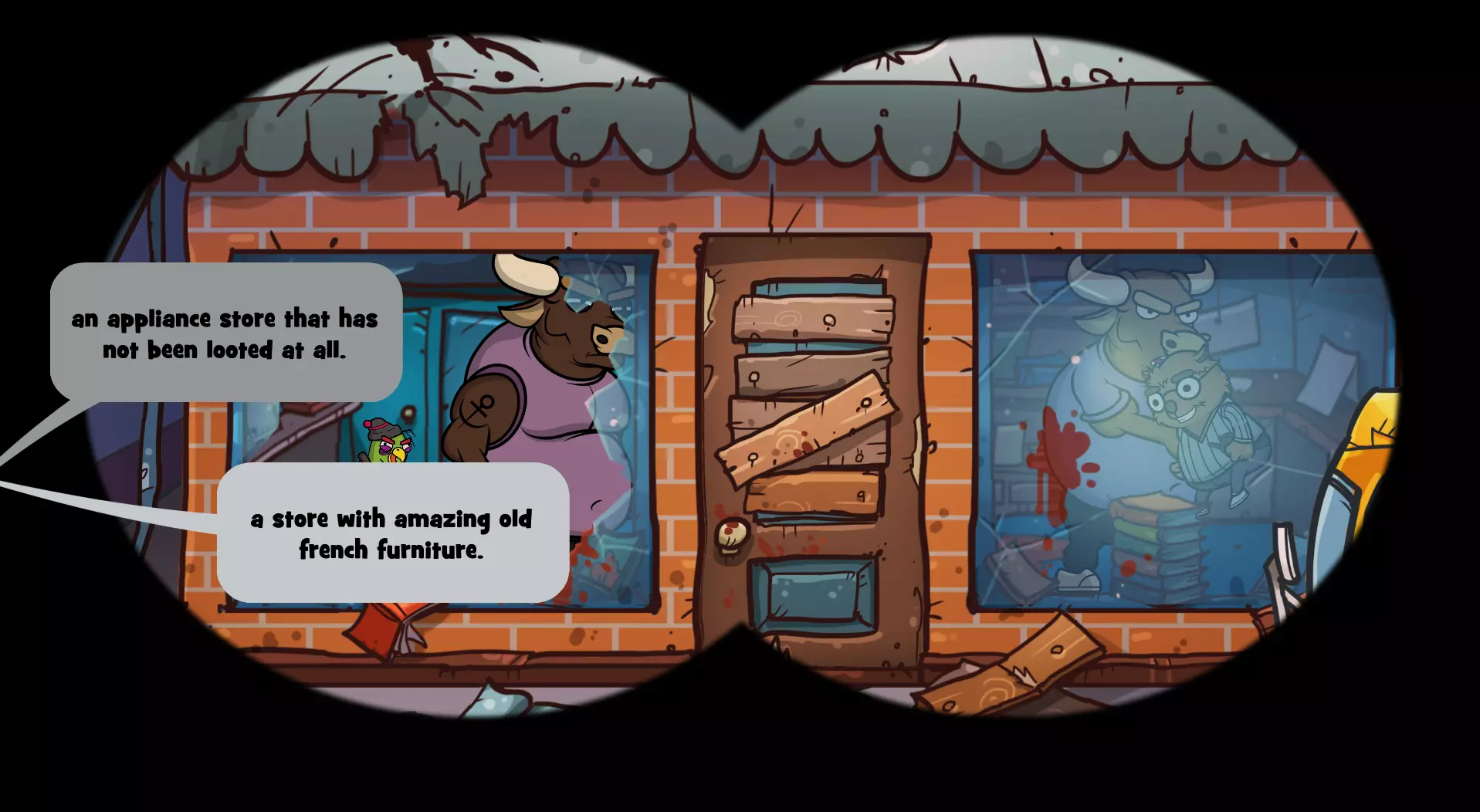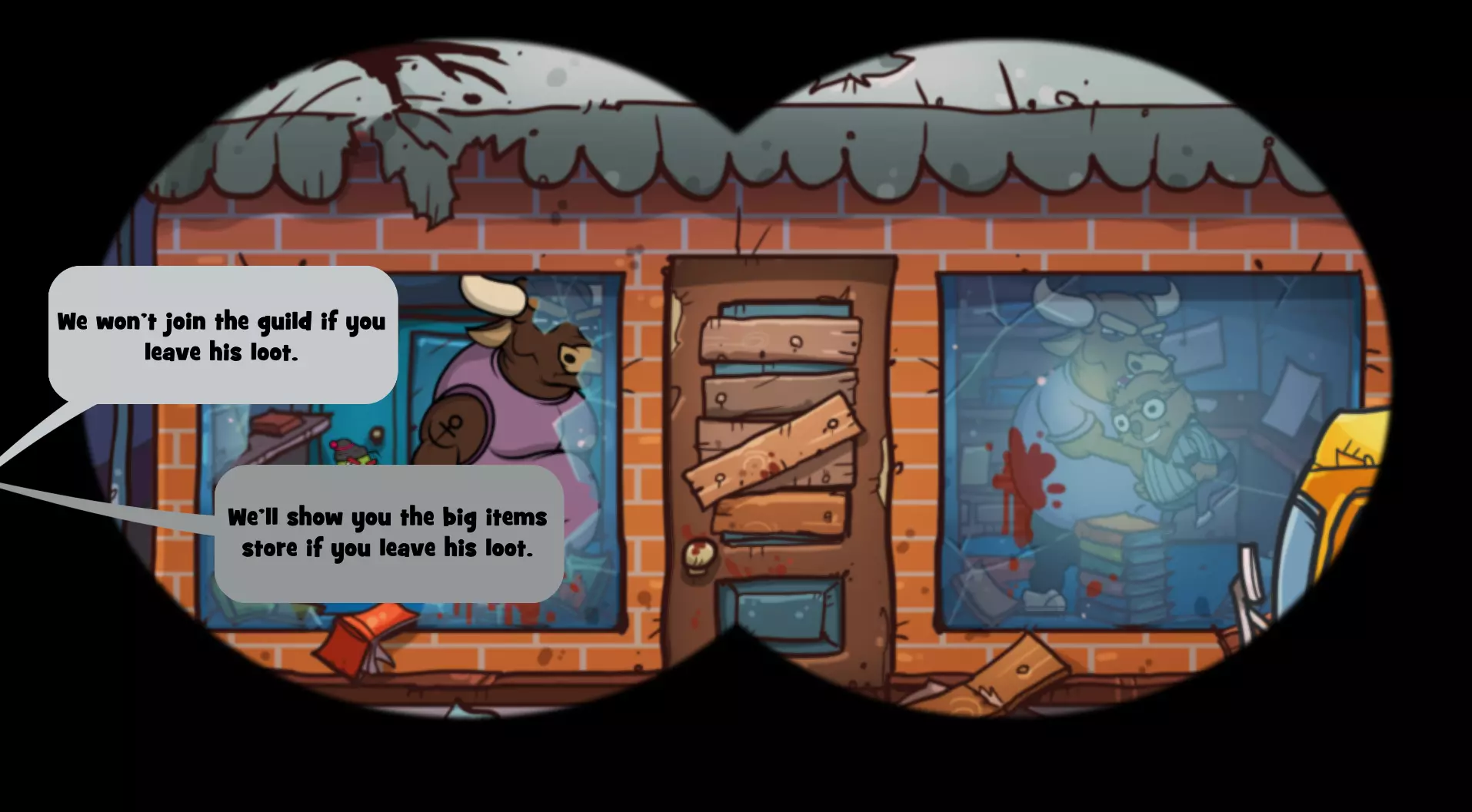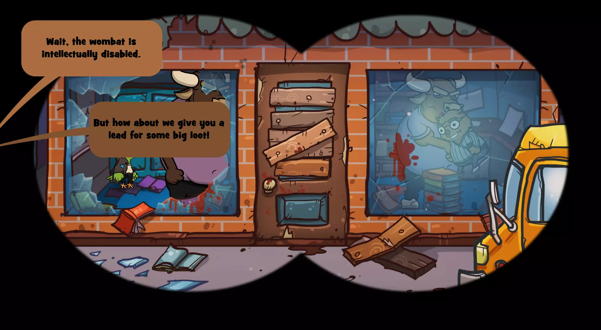 你现在应该已经获得【Sorry, Wombat】成就了! 结论 注意:如果你同时想获得【Professional Scavenger Guides】成就(向公会带回价值超过700点的战利品),就不要完成这个成就,因为袋熊会丢失他所有的物品,而书店里有一些价值最高的物品。 以下是更简洁的对话选择文本(选中的选项是最重要的,需准确选择): 地点:书店 当公牛出现在书店时,选择: “但我们来玩个不一样的游戏吧。” “在某个屋顶上用望远镜观察你。” “考虑加入。” “一家完全没有被洗劫过的电器店。” “但我们可以给你一个关于大笔 loot 的线索!” “如果你留下他的 loot,我们就带你去那家有大物件的商店。”“不,我真的和你没什么过节。” 袋熊丢失了所有物品 :( “他脑子有问题!” “当然不是我们干的。是那些混蛋干的!” “你能找到比我们好得多的队伍。” 希望这能帮到某些人! 注意2:我不确定这是否有效,但当你看到获得了这个成就后,可以尝试退出游戏再重新进入,看看是否会从头开始书店场景,让你有机会重新经历一次,避免袋熊被打,这样你就能保留你的战利品,不必从头开始!我只在前往新地点时看到游戏保存指示器,所以这可能有用?