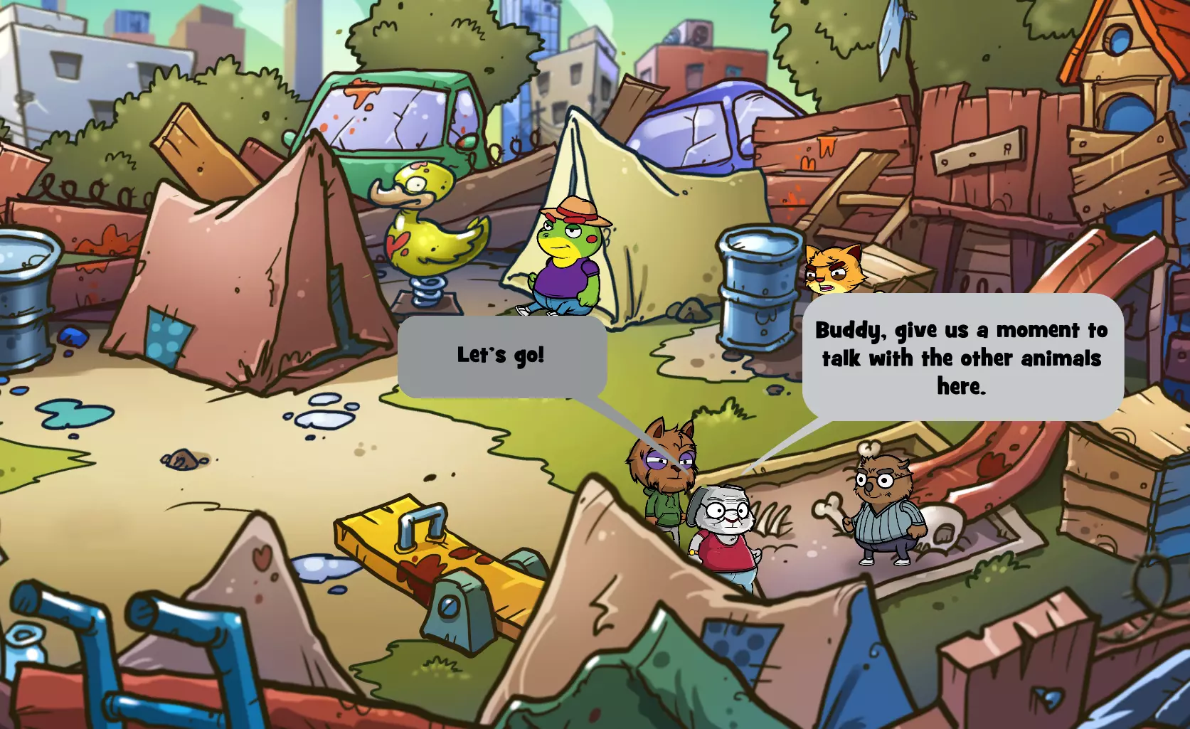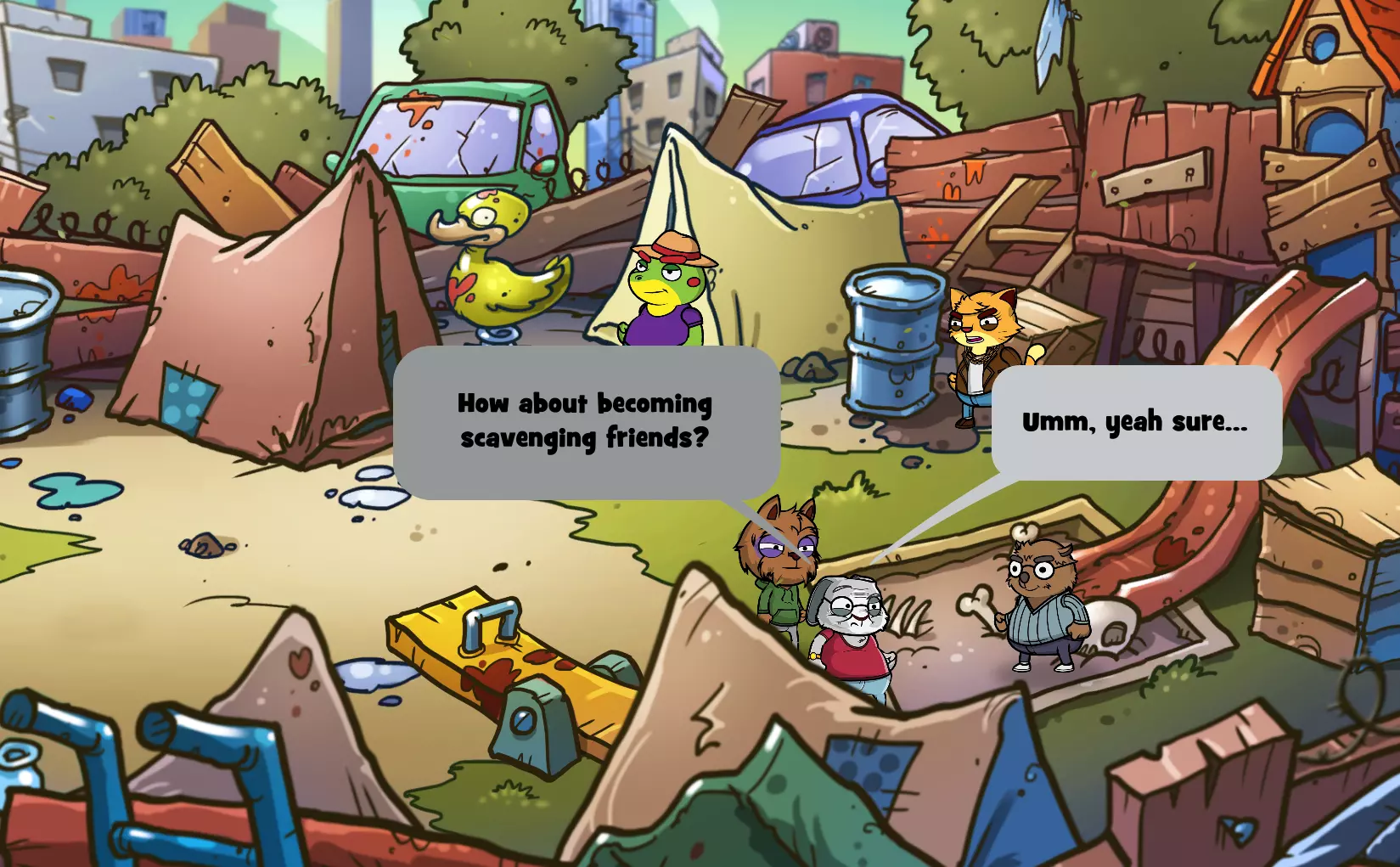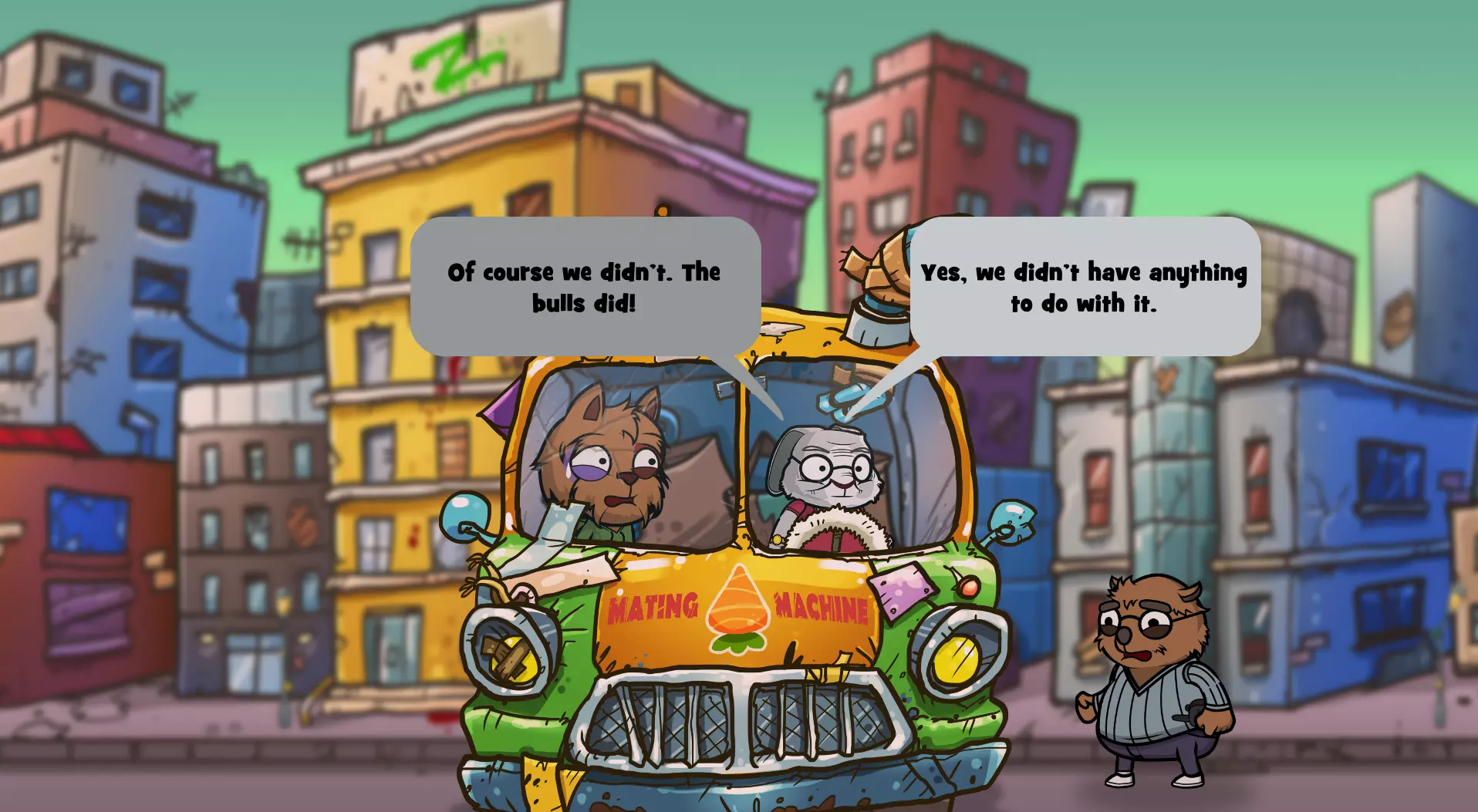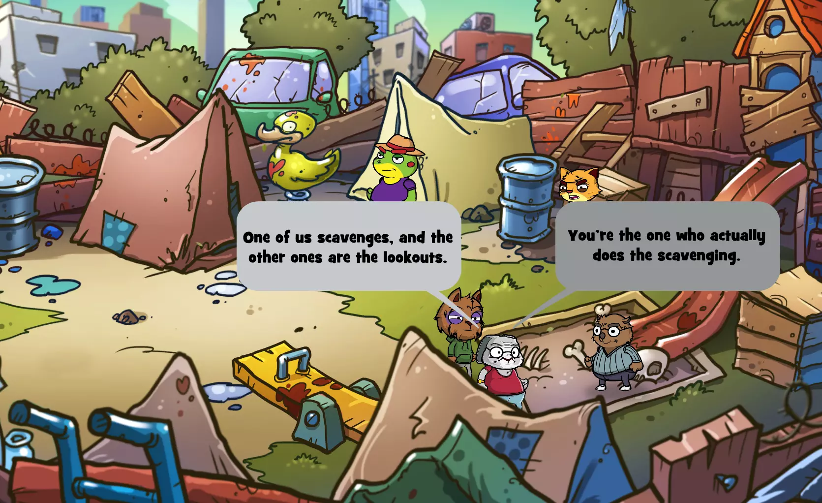 你现在应该已经获得【Sorry, Wombat】成就了! 结论 注意:如果你同时想获得【Professional Scavenger Guides】成就(向公会带回价值超过700点的战利品),就不要完成这个成就,因为袋熊会丢失他所有的物品,而书店里有一些价值最高的物品。 以下是更简洁的对话选择文本(选中的选项是最重要的,需准确选择): 地点:书店 当公牛出现在书店时,选择: “但我们来玩个不一样的游戏吧。” “在某个屋顶上用望远镜观察你。” “考虑加入。” “一家完全没有被洗劫过的电器店。” “但我们可以给你一个关于大笔 loot 的线索!” “如果你留下他的 loot,我们就带你去那家有大物件的商店。”“不,我真的和你没什么过节。” 袋熊丢失了所有物品 :( “他脑子有问题!” “当然不是我们干的。是那些混蛋干的!” “你能找到比我们好得多的队伍。” 希望这能帮到某些人! 注意2:我不确定这是否有效,但当你看到获得了这个成就后,可以尝试退出游戏再重新进入,看看是否会从头开始书店场景,让你有机会重新经历一次,避免袋熊被打,这样你就能保留你的战利品,不必从头开始!我只在前往新地点时看到游戏保存指示器,所以这可能有用?