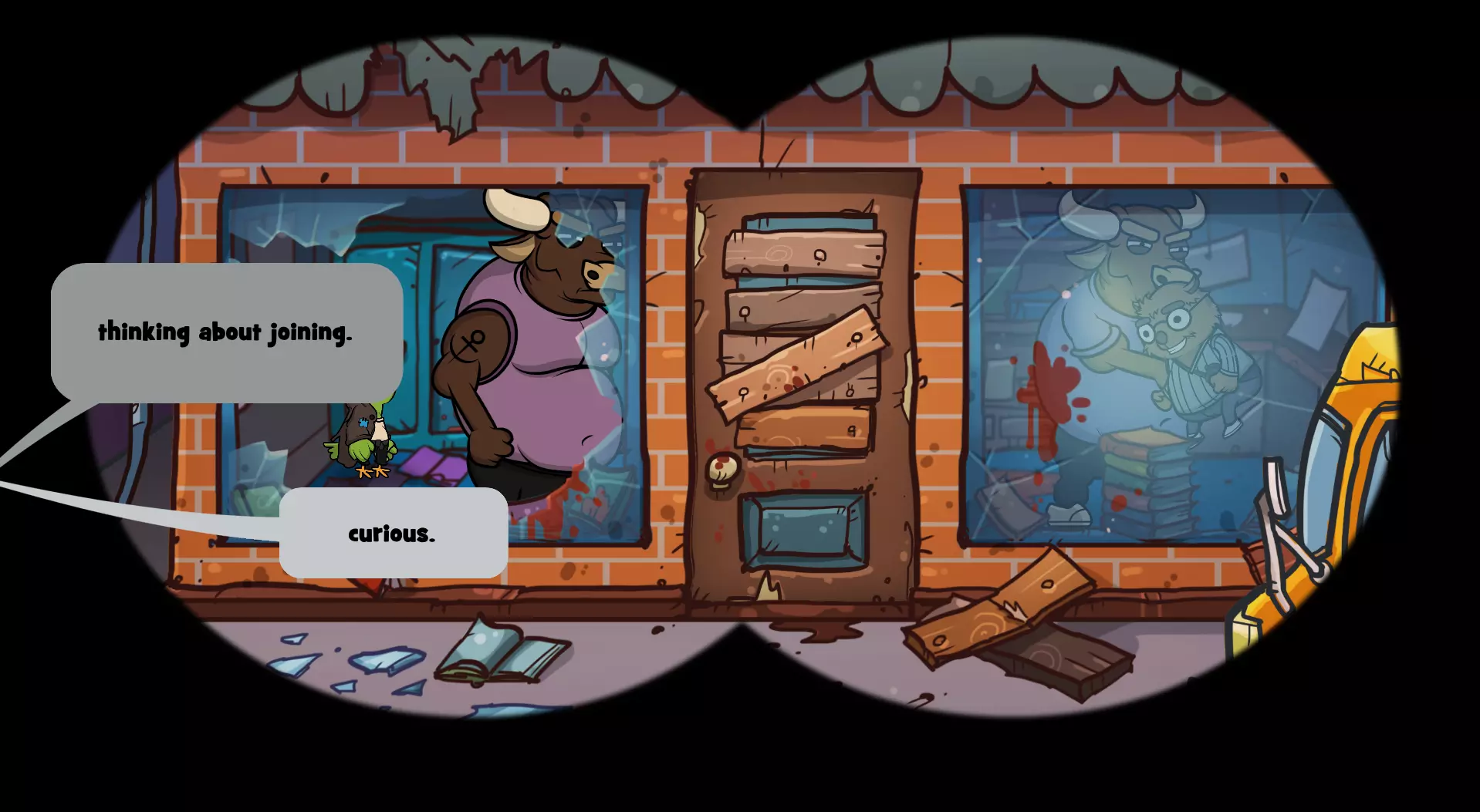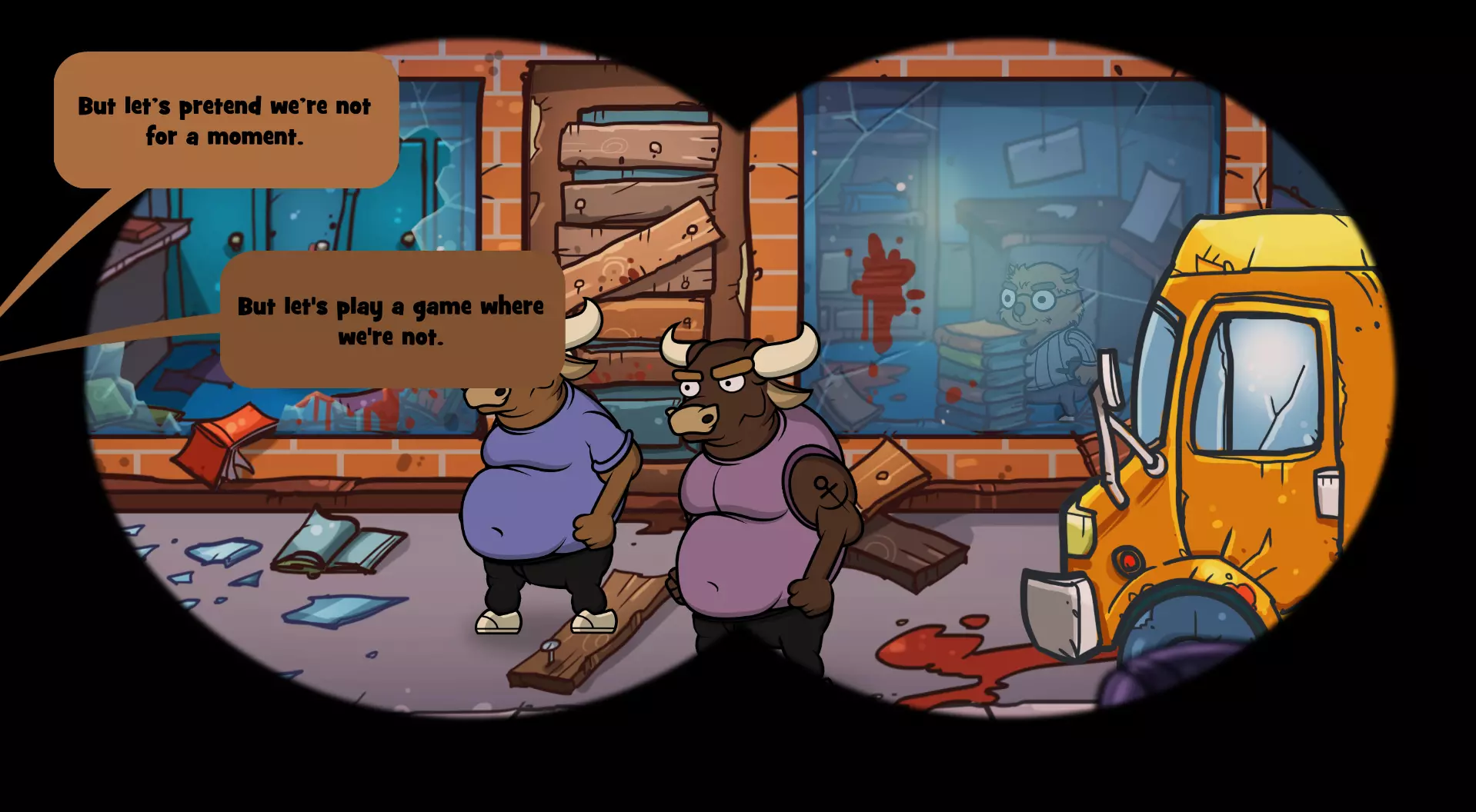 选择“出发吧!”后,你将被带到书店。 地点:书店 在公牛出现前,完成对话选择,然后选择:“不过我们来玩个不是这样的游戏吧。”
