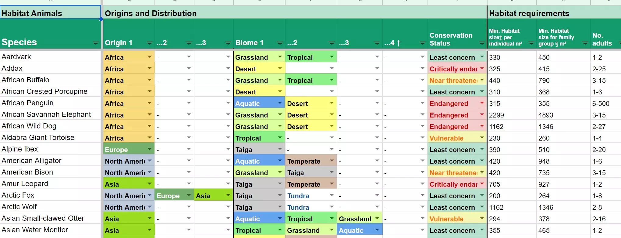 一份关于栖息地动物的电子表格,包含所有DLC。你可以按物种、地区、生物群系、行为及其他条件进行浏览。 栖息地动物数据表 目前已经有一些很棒的《动物园之星》电子表格,但在反复记录相同数据后,我忍不住制作了自己的版本。它包含所有DLC(目前更新至大洋洲更新)。这是我投入数小时高度专注完成的工作,希望能让更多人使用它!希望你喜欢其中的颜色编码。