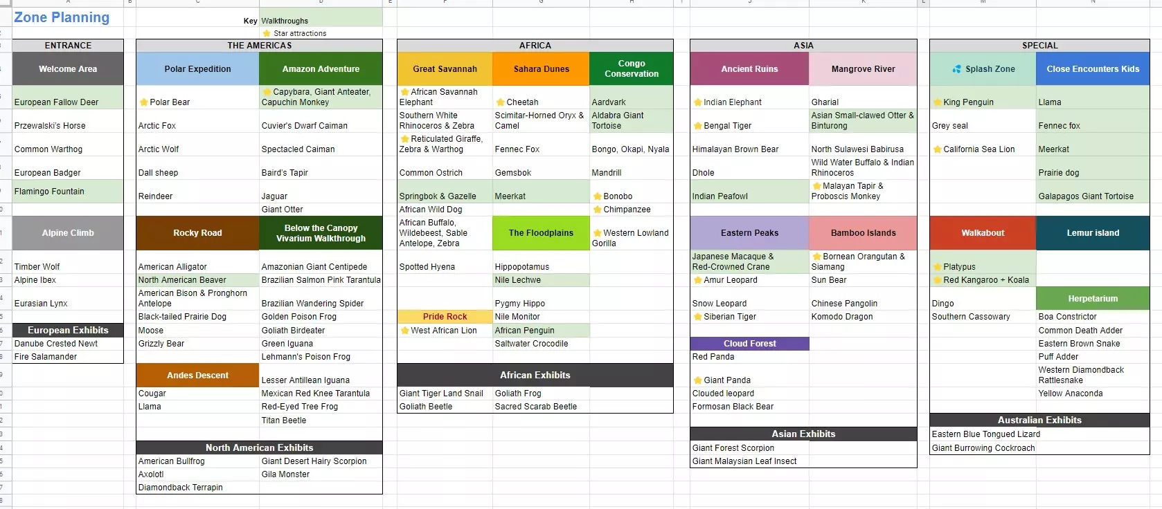 我用这个电子表格来规划布局,所以保留了包含区域规划的额外工作表。其中包括每个栖息地容纳理想数量动物所需的栖息地大小。