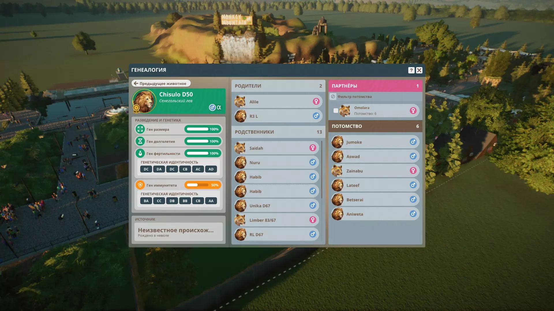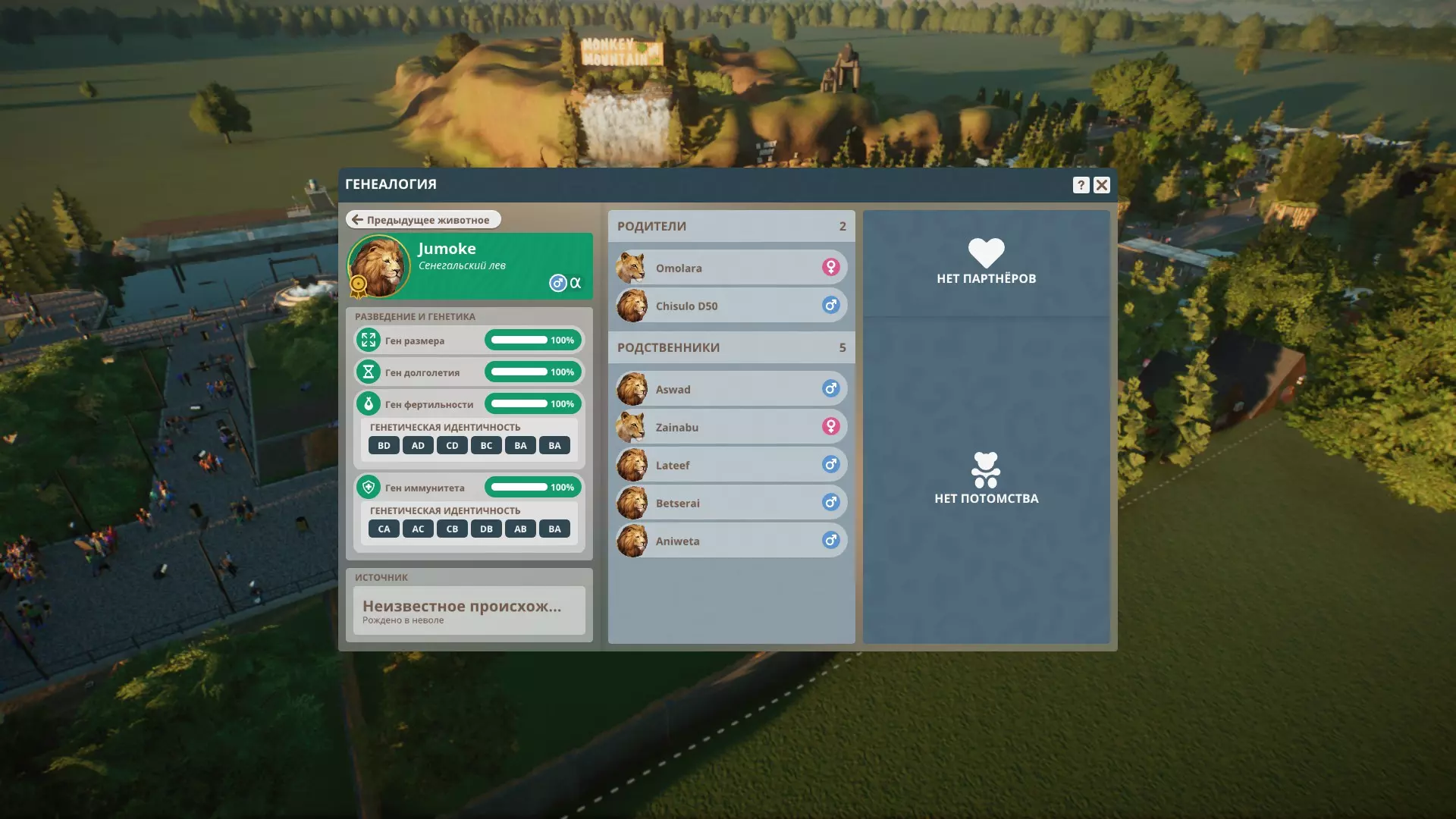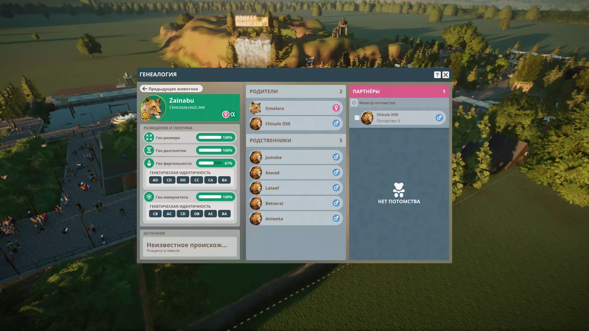 分析 我们已经弄明白了遗传学原理,但如何才能获得各项指标均为100%的动物呢? 我们将通过【谱系】板块来实现这一目标。该板块可在动物园-动物菜单(下方)中打开,选择动物后该板块会被激活,也可通过动物卡片的【谱系记录】标签页进入。 首先,分析我们现有的动物。查看它们的体型和寿命指标,我们需要的是各项指标均为100%的个体。挑选出这类动物,用特定的数字或字母为它们做标记并留在动物园中,其余的动物则全部出售。只有当父母一方拥有100%的体型基因和/或寿命基因时,才有可能从这类动物中获得四项指标均为100%的后代,可能的组合如下: 父母1 - 体型100,寿命92 父母2 - 体型92,寿命100 此外,例如,父母双方都可以拥有100%的体型基因,而其中只有一方拥有92%的寿命基因。 繁殖力和免疫力指标可以是任意数值,但百分比越高越好,且繁殖力不应为0%。 现在需要分析所选动物的基因型。我们打开每只动物的谱系,为自己记录下完整的基因型,或者只记录基因的重复情况及其出现位置。最好将它们记录下来,因为无法记住这些内容。配对 遗憾的是,开发者不允许我们查看市场上动物的谱系,我们只能通过基因型来选择可能适合自己的动物。 小技巧:你可以在多个鸟舍和/或动物园中繁殖同一物种的动物,这样你就能随时查看特定动物的谱系,更准确地选择配对。这在经济上也很划算,因为你不必购买动物并猜测它是否合适,你会确切知道结果。 目标是选择一对动物,其后代的基因型不会出现双重密码子。为此,我们首先需要确保一方父母的字母对在对应位置上与另一方父母的字母对不重合。请务必在【吸引力】标签页中,将体型和寿命基因的筛选条件设为100%。如果不进行选择,这两项数值会降至92%。 查看【伴侣对比】标签页,该页面信息虽不够详尽,但能帮助我们淘汰部分动物。 购买后,只有将潜在亲本放入鸟舍,才能查看其谱系。我们可能需要购买几只个体,才能找到一个勉强合适的。其余的则送回出售。 我们还会对比亲本的所有密码子,并推测可能出现字母配对的位置。如果多个字母匹配,那么配对的概率如下: 1个字母——50%(例如AB和CB) 2个字母(不同)——50%(例如AB和BA) 3个字母——75%(例如AA和AB) 4个字母——100%(相同密码子中的AA和AA) 找到理想的配对极为困难,因此我们会购买可能合适的动物并进行分析。如果最多有5个密码子,这是一个不错的选择,但密码子越少越好。你总是需要承担风险,但按照这种方法,你将更频繁地培育出具有3项或更多100%指标的动物。 示例 母狮是在我的动物园中培育的,雄狮是从外部购买的。 让我们分析母狮:她的体型、寿命和免疫力指标均为100%,繁殖力为83%(密码子6中重复出现BB)。因此,我们需要找到在6个生育密码子中完全不含字母B的狮子。顺便说一下,字母B负责长寿基因,我们能看到它的重复,但同时该指标本身是100%。这再次证明并表明,体型基因(A)和长寿基因(B)的遗传方式不同,与生育和免疫基因无关。