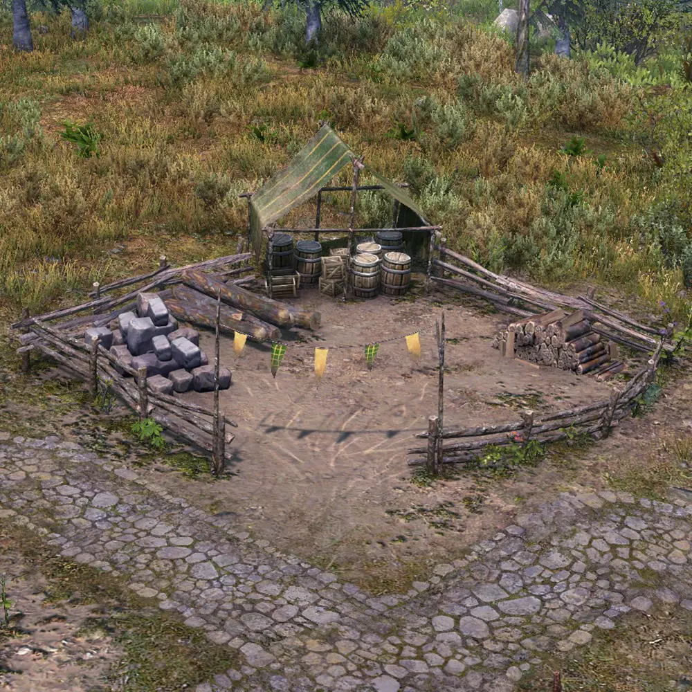 用途:前期游戏存储/原材料/可用物品 不适用:食物/原材料(后期游戏) 堆料场 堆料场与储物车基本相同,但以无法移动为代价提供了稍多的存储空间。 它适用于前期游戏存储,应用于存储建筑材料/原材料。如果计划这样使用,请注意建筑的放置位置,显然存在资源重量机制,工人搬运某些较重的原材料时会移动得更慢。
