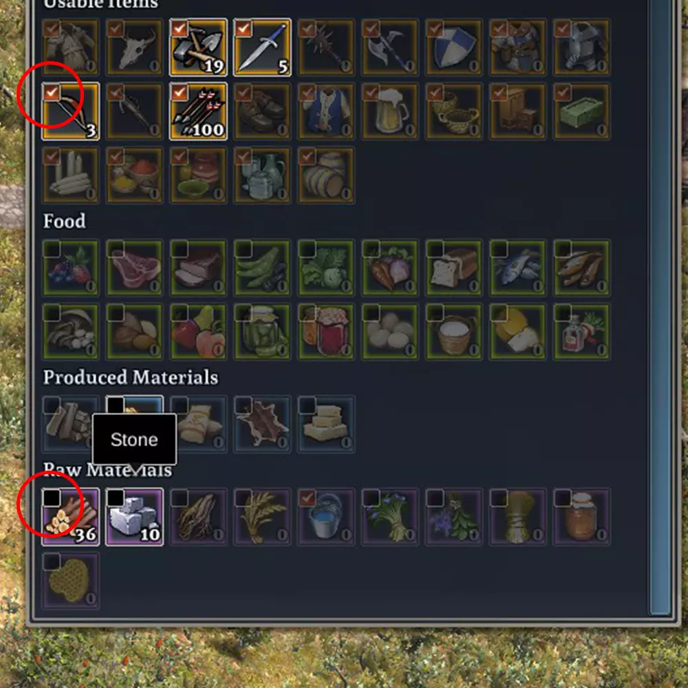 用途:原材料/生产材料/可用物品 不适用:食物储存(除非你还没有地窖) 储存技巧与优化 有几种方法可以优化你的储存,使其更有效地工作。随着更新发布或发现更多技巧,我会继续补充和修改本节信息。 分配储存 你可以通过点击每个资源左上角的复选框,来为每个建筑简单地分配储存,开启或关闭该建筑的储存功能。