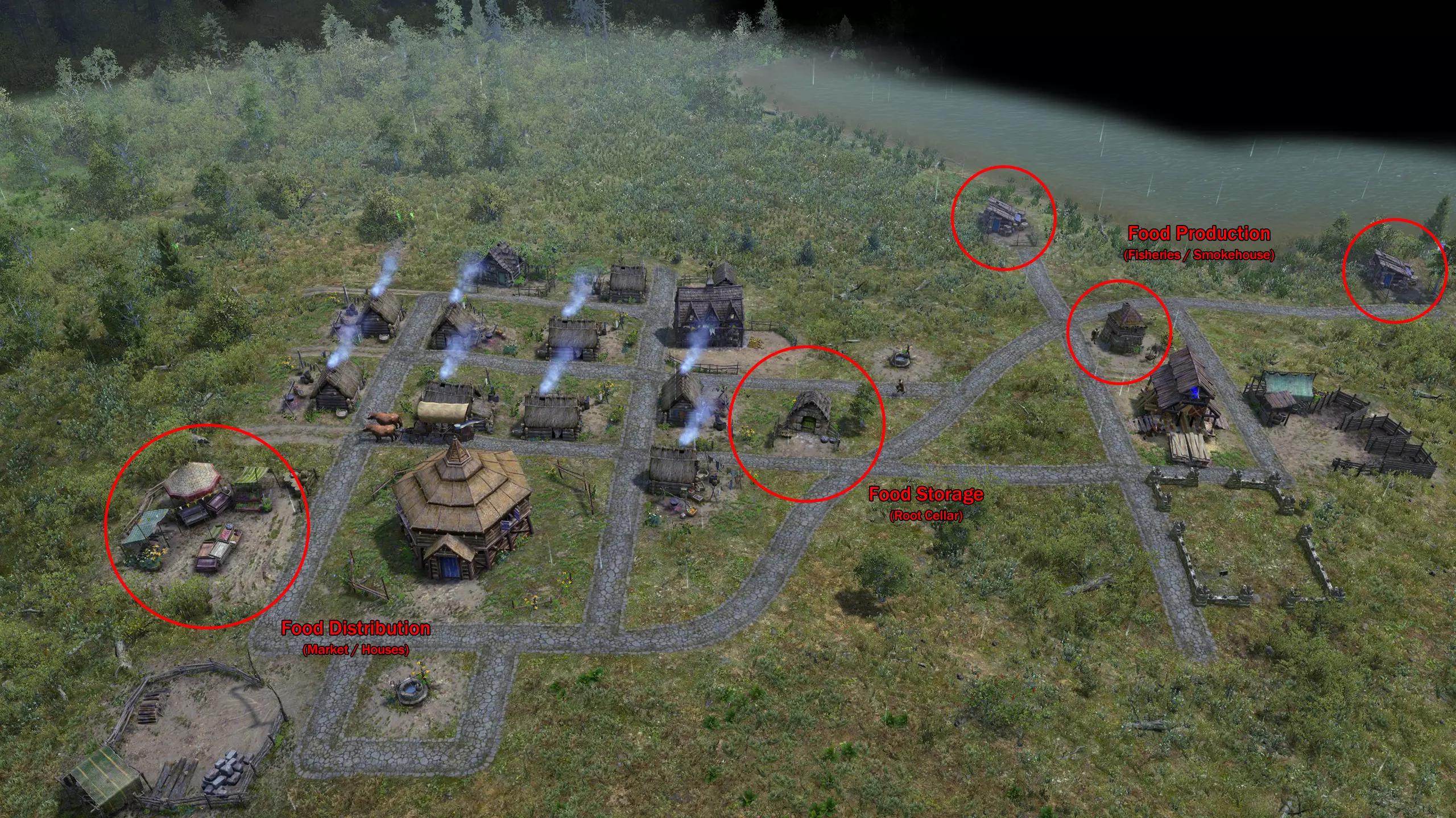 我已经在建筑部分提到过这一点,但下面我会列出每个建筑的存储建议。只需取消勾选除以下为每个建筑列出的内容之外的所有选项。 存储推车:使用【早期游戏】|【原材料】和【可用物品】 堆料场:【原材料】和【生产材料】 地窖:所有它能存储的物品(主要是【食物】和【草药】) 仓库:【原材料】、【生产材料】和【可用物品】 存储位置 存储位置相对于生产和分配的位置很重要,因为过长的移动时间会降低生产力,这对食物来说尤其重要。 其实很简单,只需将你的存储设施放置在生产和分配区域的中间位置,如下方图片所示。如果无法放在正中间,尽量让它稍微靠近生产区域以保持生产数量,分配工作应随之进行。