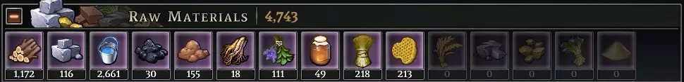 例如:肉类、鱼类、浆果、面包等。 生产材料 由前述原材料加工或提炼而成的材料,对于建造和升级城镇以及生产更特定的物品至关重要。
