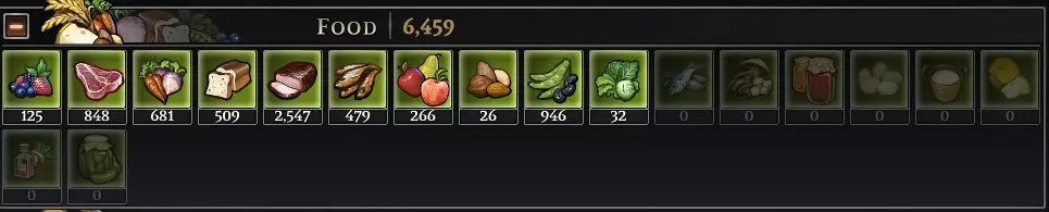 例如:木材、石头、铁、草药等。 食物 可以说是游戏中任何阶段最重要的资源,包括生食材和精制食品。妥善储存至关重要,因为大多数食物都会变质,只是有些食物的变质速度较慢。