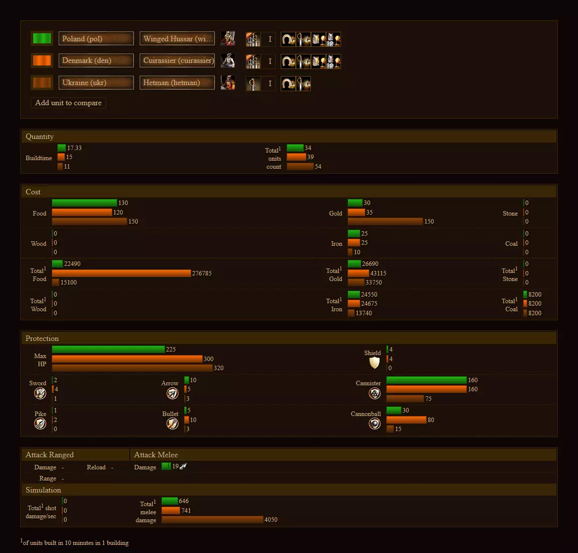 功能 - 数据由游戏内脚本生成(因此未来更新将耗时不到5分钟) - 单位基础属性(攻击(包括射程、伤害、装填时间)、防御、生命值、建造时间、成本) - 总属性(10分钟内建造单位的攻击、防御、成本、数量总和,即将支持自定义时长) - 可切换兵营/马厩、铁匠铺和学院的升级,这些升级会影响单个单位和总属性 - 便捷的单位对比功能 - 可选择您在游戏中喜欢使用的颜色 - 支持Mac系统 计划功能 - 可选择建筑数量(将影响成本) - 可选择建造时间(当前固定为10分钟) - 阵型加成 - 总防御值 - 战斗模拟(取决于对敌方武器的攻击和防御、射程等因素) 已知问题 - 列出了部分无法在游戏中建造的额外单位(例如萨克森的胸甲骑兵或轻骑兵 列出了3个隐藏国家(misc、tat和lit)(这更像是彩蛋) 更改升级或添加单位后,属性表会动态调整列宽 骑兵攻击力有时会错误地与铁匠铺的剑类升级一起计算 颜色仅在更改单位后更新,而不是仅更改颜色本身时更新
