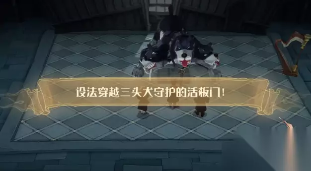 攻略 1、首先我们会看到通关的任务是:设法穿越三头犬守护的活板门!