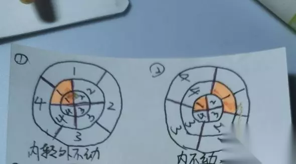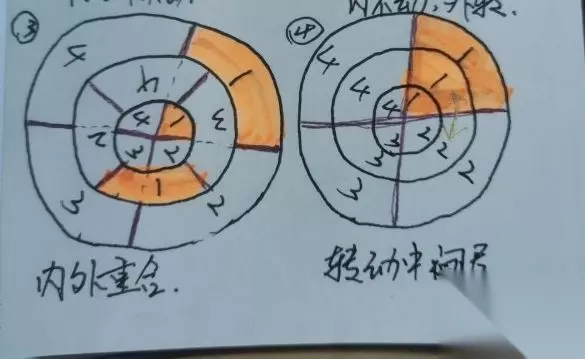 之后我们可以看出来,最外层转盘转动时,会带动中间转盘转动;最内层转盘转动时,也会带动中间转盘转动;而中间转盘转动时会带动内外两侧转盘同向、同幅度转动。 了解这一规律以后,我们就可以①先将内(或外)层转盘调整至与中间转盘重合,并且选择一瓣叶片记住它的形状(中间的和一侧的形状都要记住);