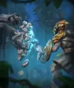 戈尔拉克蛮兵会召唤一名劈砍者,但若你在此牌之前打出的是一张3费法术牌,它还会额外召唤一名冲撞者。 这是一张非常强力的卡牌,因为冲撞者搭配劈砍者是一套致命组合,尤其在恰当的时机打出时,很难被反制。 反制方法:戈尔拉克蛮兵是一张极具威胁的卡牌,当对手打出它时,务必用眩晕枪兵来阻挡冲撞者,同时用一些低费单位来牵制劈砍者;如果两者都攻到你的塔楼,它们将造成巨额伤害。 丛林乱斗