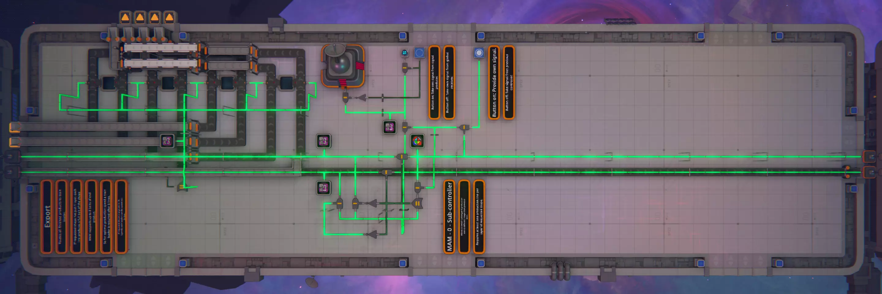 主控制器有两种运行模式。其接线实际上相当简单。它要么从全局线路接收器获取形状模板,要么允许通过信号生成器手动输入模板。一个按钮可在这两种模式之间切换。 第二个按钮用于开关整个MAM。 控制信号:会向后续的线路控制器发送两个线路信号。对于主控制器,这两个信号是相同的,包含通过上述两种方法之一设置的形状模板。 导出:控制器平台同时作为导出火车站。形状会经过检查,有缺陷的形状会被丢弃,然后才会被送入火车装载器。它最多可处理八条形状传送带。线控器