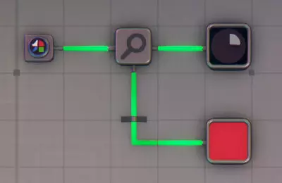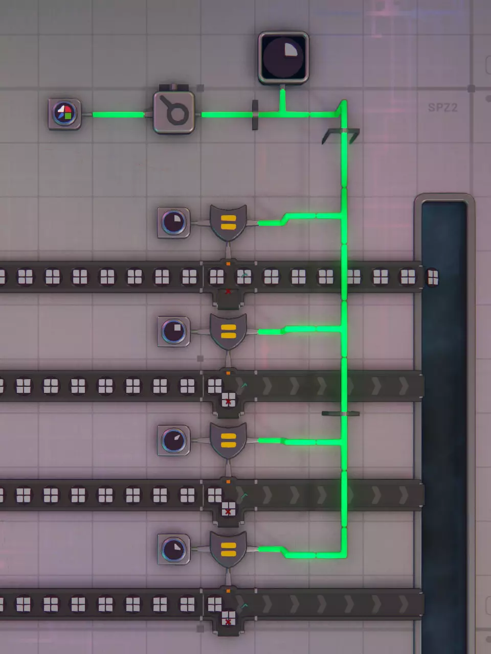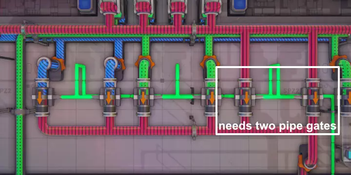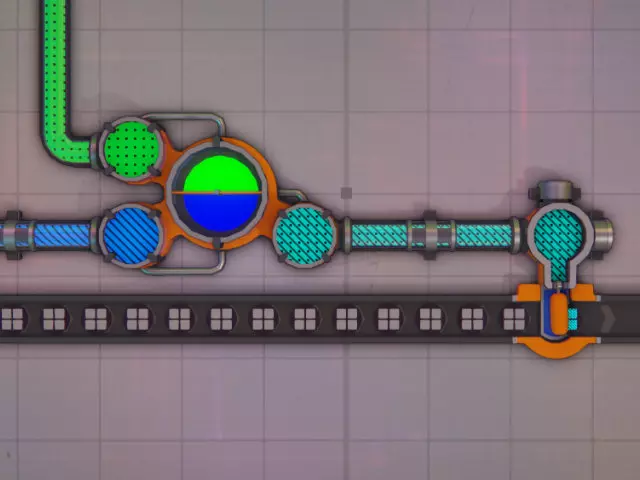 由于仅提供三种原色,因此需要现场调配间色和复色。每个调色器有两个输入端和一个输出端,它会消耗各0.5单位的输入材料来生成1单位的输出材料。一个调色器可以为两名画家供料。每条传送带需要四名画家,因此需要两个调色器。 管道闸门 最简单的设置是每条传送带每种颜色配备两个调色器(白色需要三个),这样每条传送带总共需要9个调色器。不过,借助管道闸门,可以将调色器的输入端切换为不同颜色。通过这种方式,每条传送带仅需三个调色器就能调配出所有可用颜色。要生成所有二次色,装置需要能够提供以下输入组合: 输入1 输入2 输出 红色 绿色 黄色 红色 蓝色 品红色 绿色 蓝色 青色 黄色 蓝色 白色 对于白色,任何二次色都可以与对应的原色混合,此处随机选择了黄色和蓝色。输入颜色的选择唯一影响的是每种原色的消耗量:生成1单位白色时,黄色与蓝色的组合会消耗½单位蓝色,但仅消耗¼单位红色和¼单位绿色。
