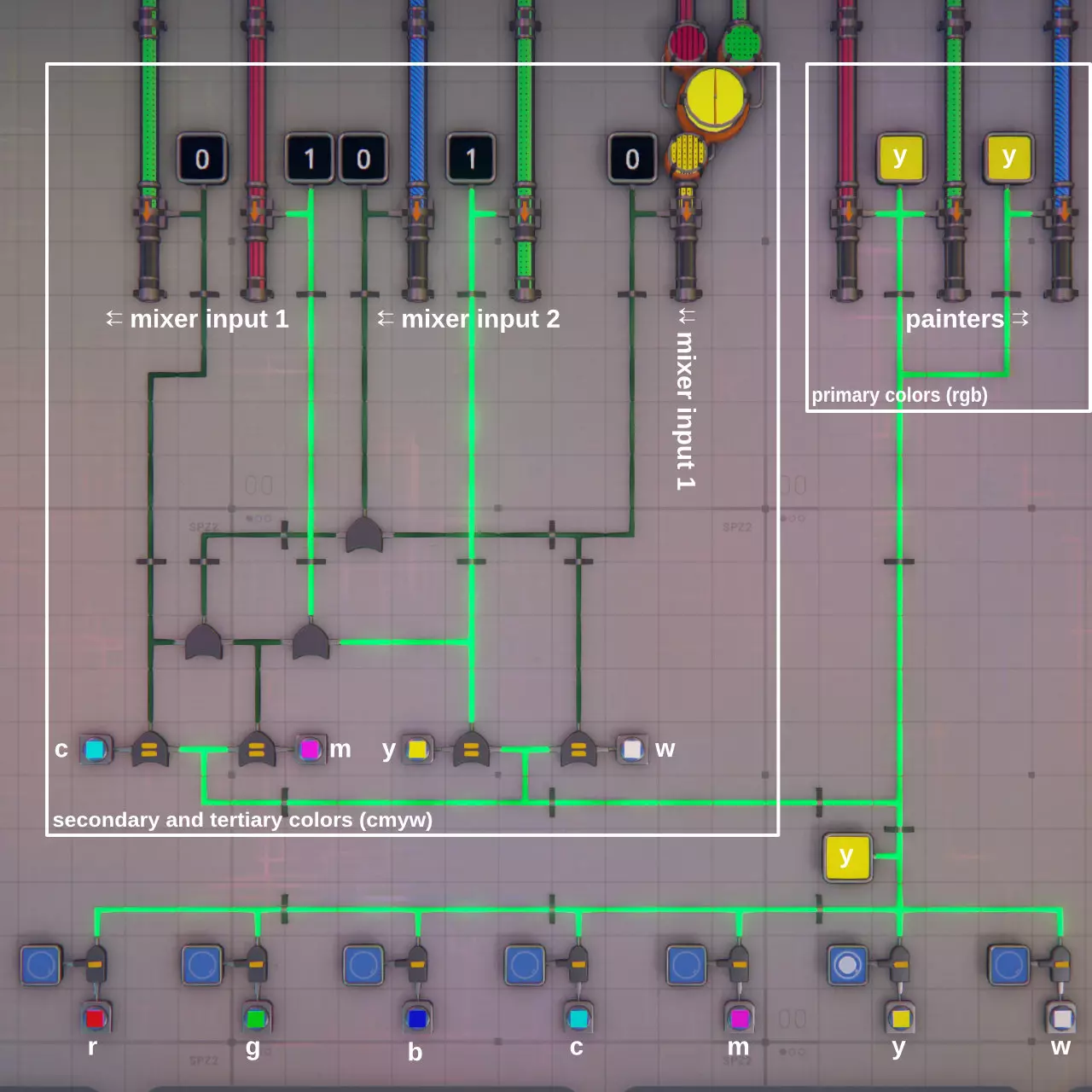 左侧图像展示了管道闸门的控制电路。底部的按钮和信号发生器仅用于为电路提供测试信号。目前,给出的是黄色的“color-y”信号。 右侧的三种原色最为简单。如果管道闸门接收到颜色信号,它将只允许该颜色通过。因此,未改变的颜色信号会传送到管道闸门,当管道中的颜色与信号匹配时,闸门允许流体通过。当前信号为黄色,所以所有三个管道闸门均处于关闭状态。 左侧是为混合器供电并生成二次色和三次色的电路。它向管道闸门发送“1”(真)或“0”(假)信号。管道闸门在接收到“1”信号时打开,接收到“0”信号时关闭。前四次比较会检查输入信号是否与任何次要或 tertiary 颜色(原词:tertiary colors)相等。如果是,比较器会输出“1”信号;如果不是,则输出“0”。此输出信号现在会传送到对应原色的管道门。在图片中,请求的是黄色,因此输入1的红色和输入2的绿色被开启。 游戏对“0”信号和无信号的处理方式不同。尽管线路不会亮起,但在游戏中,“0”是一个实际的信号。因此,如果同一线路中同时传入“1”和“0”信号,“1”不会覆盖“0”,而是线路会因信号冲突而产生错误。因此,如果多条线路通向同一个管道闸门,它们不能直接合并,而必须通过或门进行组合。 最后一个注意事项:管道闸门的吞吐量与流体发射器/接收器相同,也就是说非常小。一个管道闸门刚好能为四个喷漆器供色,因此在这种设置下一个闸门就足够了。如果需要更高的吞吐量,则必须使用多个管道闸门。 重新路由未喷漆部件:最后需要一种方法,将不应喷漆的部件绕过喷漆器进行路由。此时可以进行另一个比较,即与“color-u”未喷漆信号进行比较,由该信号控制传送带过滤器来实现这一功能。 1.3. 图层组装