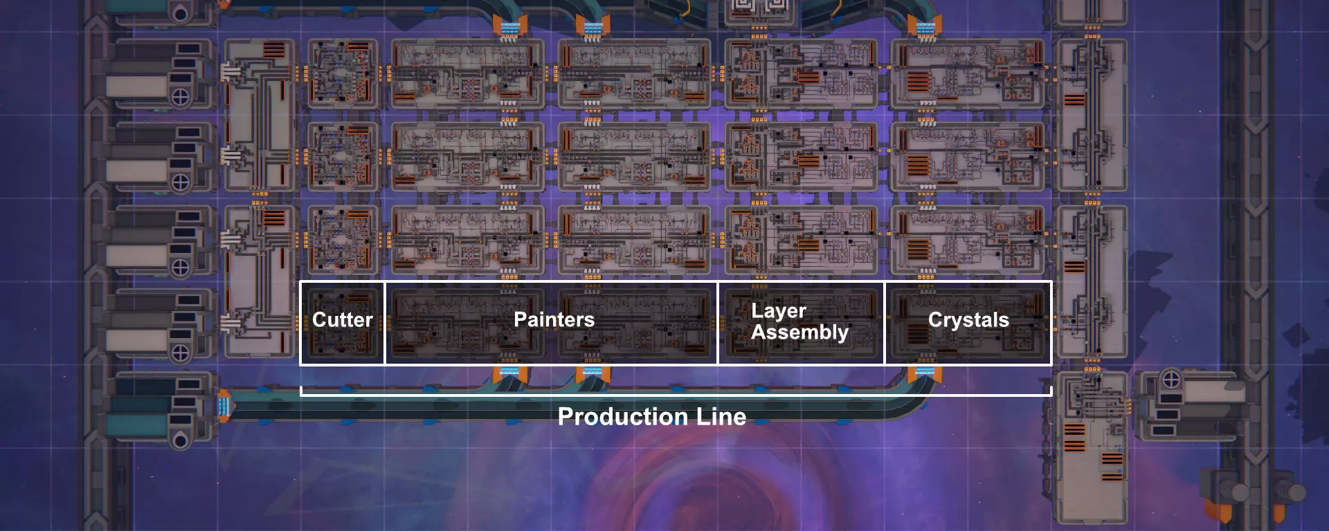 颜色的现场混合方式与上方的绘画模块相同。请注意,晶体生成器比绘画器消耗更多颜料,因此一条传送带需要四个混合器而非两个。此外,一个流体收集器只能为三个晶体生成器供能。由于每条传送带需要六个生成器,因此每种基色需要两个流体收集器。管道闸门的吞吐量与流体收集器相同,因此对于基色,闸门也必须加倍以避免瓶颈。由于颜色混合器仅使用每种输入的½单位来生成1单位的输出,因此每个颜色只需一个管道闸门的混合器设置即可正常工作。 如果不应生成晶体,则形状会绕过晶体生成器进行传送。否则,它们会通过生成器,任何间隙或销钉都用晶体填充。 在进行最终检查以确保组装出正确形状后,该形状会离开生产线并被送往线路控制器。 2. 控制基础设施 这些模块控制生产,并决定将哪个生产模板发送到哪条线路,以组装多层形状,并确保所有线路始终得到优化利用。额外的子控制器允许在需要小批量多种形状的情况下,将MAM的部分切换到不同产品。 由于模板形状的每一层都需要使用一条生产线,因此四条(困难难度为五条)线路是所需的最低数量。拥有8条生产线的MAM(制造与组装模块)可以生产1条5层形状传送带、2条4层或3层形状传送带、4条2层形状传送带以及8条1层形状传送带。如果生产线数量是模板形状层数的倍数,所有生产线都能被充分利用,否则会有部分生产线闲置。因此,12条、20条、48条和60条生产线的MAM效率最高。MAM本身的布局设计使其适合采用8的倍数的生产线数量。 所有控制模块还会将成品形状输送至出口。它们的容量为8条传送带,因此除非从不生产1层形状,否则每8条生产线后都需要一个出口火车站。 2.1. 主控制器