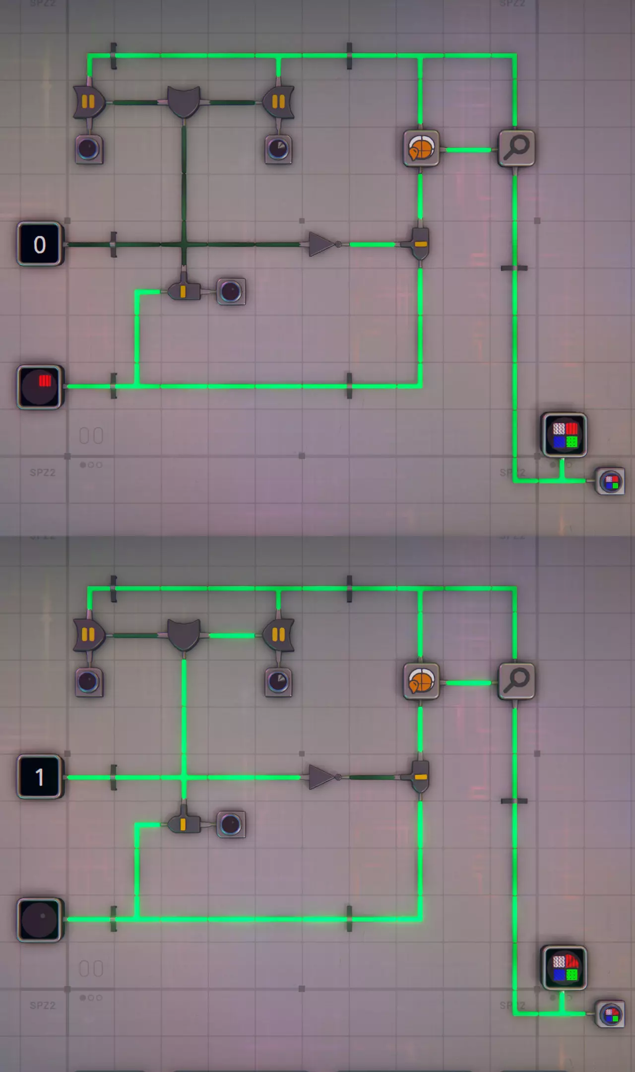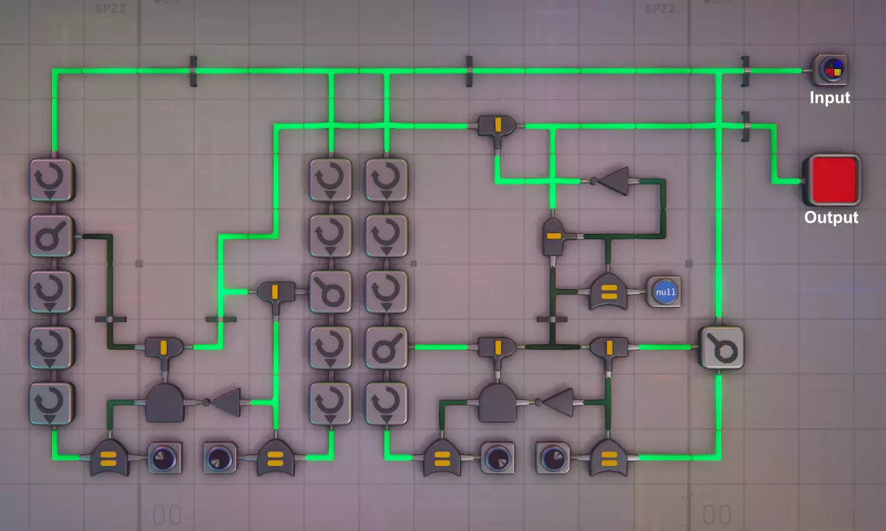 与之前的模块类似,形状模板的四个部分均由形状分析器进行检查。该电路有两个输出。第一个输出是布尔值,若该部件是引脚或晶体则为真“1”,否则为假“0”。此输出用于控制该部件的引脚输送。 第二个输出中,电路会返回经过正确旋转和着色的部件,但晶体会被替换为引脚。 旁边的图片展示了该电路。上半部分中,被分析的模板部件是一个红色正方形。它既不是引脚也不是晶体,因此第一个输出为假“0”。第二个输出是未改变的红色正方形“Rr------”。形状分析器会分别输出未着色的类型和颜色,因此要恢复未更改的部分,必须通过模拟绘制器将两者重新组合。 在图像的下半部分,红色正方形已被更改为红色晶体。现在,第一个输出为真“1”,第二个输出已更改为引脚“P-------”。 请注意,引脚没有颜色,因此如果形状分析器检测到引脚,它将不会输出颜色信号。如果模拟绘制器没有同时获得类型和颜色输入,它也不会输出任何信号。因此,引脚信号要么像这里一样绕过绘制器,要么必须向绘制器提供颜色信号。 此电路为四个部分中的每一个都进行了复制。添加引脚 对于四个部件中的每一个,控制电路发出的布尔信号将决定是否需要替换引脚。切割模块采用与上述切割器类似的布局,用于切割单层全引脚形状,然后将引脚插入传送带。 组装四个部件 首先,根据电路的第二个输出来检查部件,不符合模板的部件将被丢弃。这一步在组装前进行,因为在生产变更的情况下,丢弃单个部件而非整个层,在某些情况下可以让传送带更快清空。 然后,三组堆叠器将部件组装起来。首先将部件1和2、部件3和4分别组合,然后将得到的半层再次组合成一个完整的层。如果模板中有零件空缺,那么对应的传送带就会是空的。仅单侧输入的堆叠器会阻塞传送带,因此在这种情况下,另一条传送带必须绕过堆叠器。 方便的是,如果某个零件为空缺,控制电路的输出2将不会有信号。因此,将组合的两个零件的输出2通过与门发送即可解决问题。对于最后一组堆叠器,需要检查【(零件1或零件2)与(零件3或零件4)】是否有信号,因此还需要额外使用两个或门。