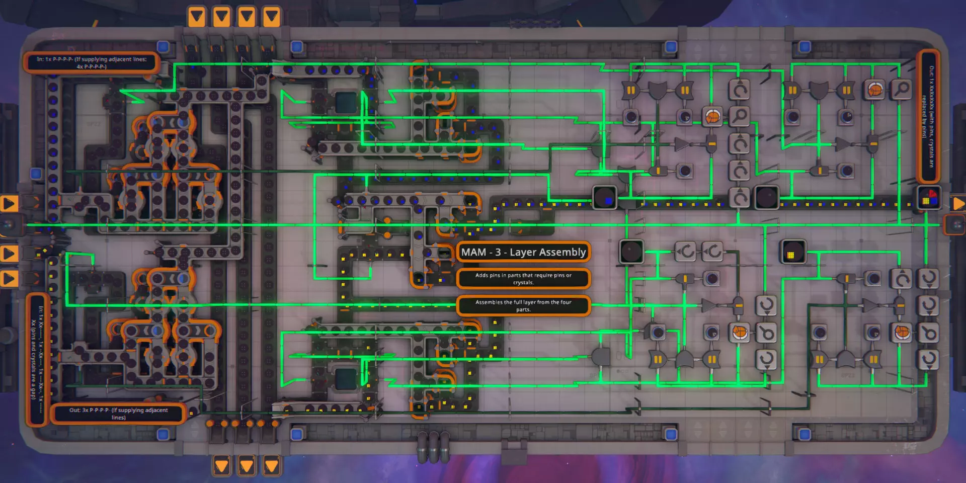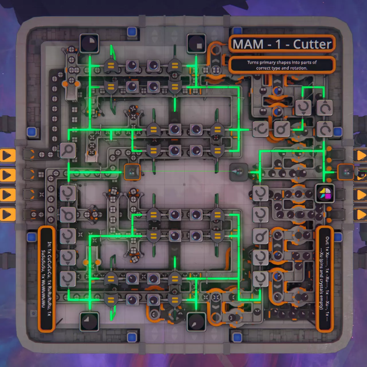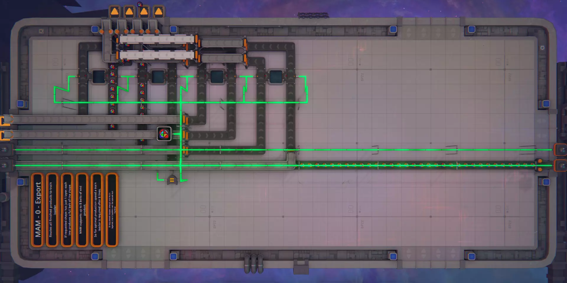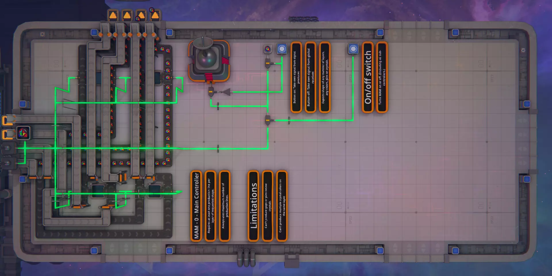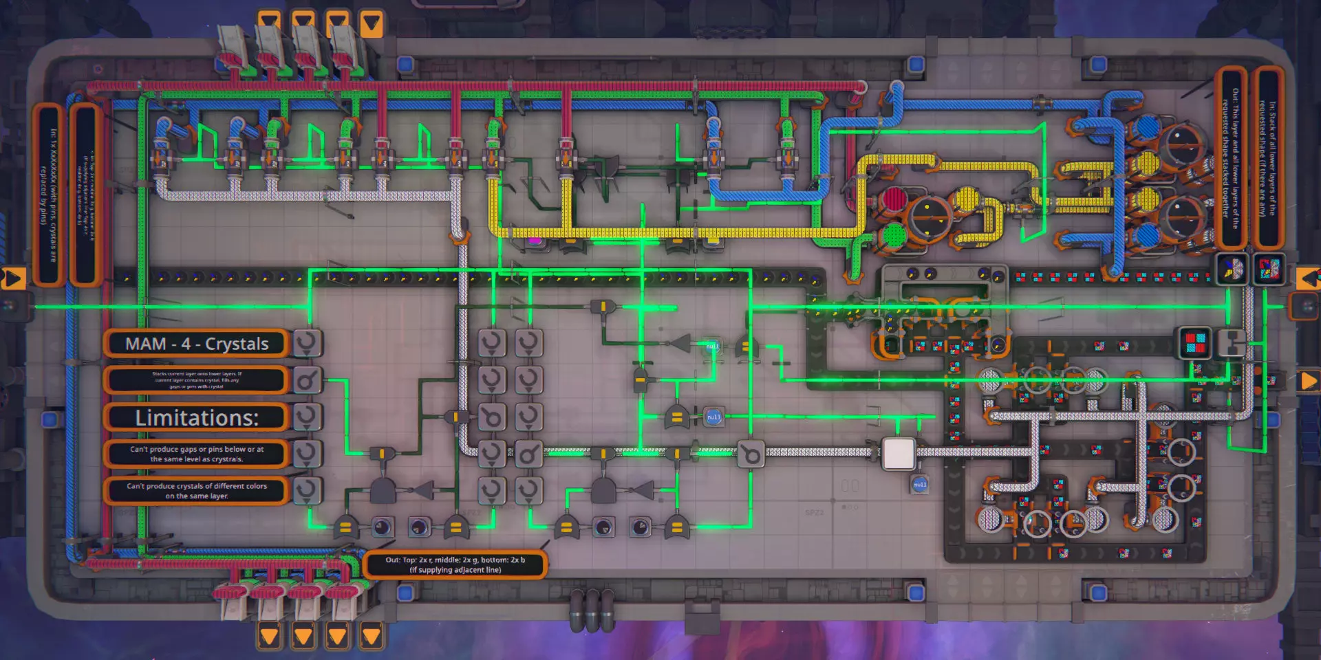 一份带蓝图的分步指南,用于构建可扩展的MAM(万能制造机),它可以生产任何随机的操作器形状。 简介 在本指南中,我将详细介绍MAM每个模块的设计并解释其功能。每个模块的蓝图可在其对应章节以及指南末尾找到。 当提及形状时,我将使用与游戏相同的符号和顺序。一个形状由多个图层组成,每个图层包含四个部件,部件有类型和颜色之分。第一个部件“Cu------”位于右上角,第二个部件“--Cu----”位于右下角,其余部件按顺时针方向排列。 此MAM是在游戏的0.0.9-rc7版本中构建的。如果你想查看成品并自行了解其功能,或者只是想复制MAM,本指南底部有几个不同尺寸的完整MAM蓝图。 设计注意事项 MAM仅接受基础形状(1层,所有四个部件未着色且类型相同)和基础颜色(红、绿、蓝)作为输入,并在现场生产出其他所有物品。 MAM将按生产线进行组织。每条生产线接收一整条传送带的每种基础形状,并输出一整条传送带的所需形状的单个图层。多层形状每层需要一条生产线。 MAM从一端接收输入,并在另一端输出所需形状。它可以向侧面无限扩展。限制条件 虽然此MAM可以生成所有随机的操作器形状,但它并非通用型MAM。 它无法在晶体层下方生成间隙或引脚。 它无法在同一层内生成不同颜色的晶体。 MAM
