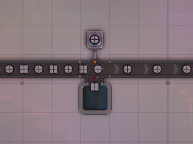 在这种情况下,只需要类型信号。它会与信号生成器设置的静态信号进行比较。如果匹配,比较结果会输出布尔值“1”(真);如果不匹配,则输出“0”(假)。当信号为“1”时,传送带过滤器允许形状通过;当信号为“0”时,会将形状分流到侧面。由于侧面没有连接任何路径,传送带会一直卡住,直到信号发生变化。 假设输入传送带已正确排序,该电路不会检查传送带上实际的物品。根据图片中信号生成器的设置,从上到下的传送带应依次运送圆形、正方形、星形,最后是菱形。 分割成部分
