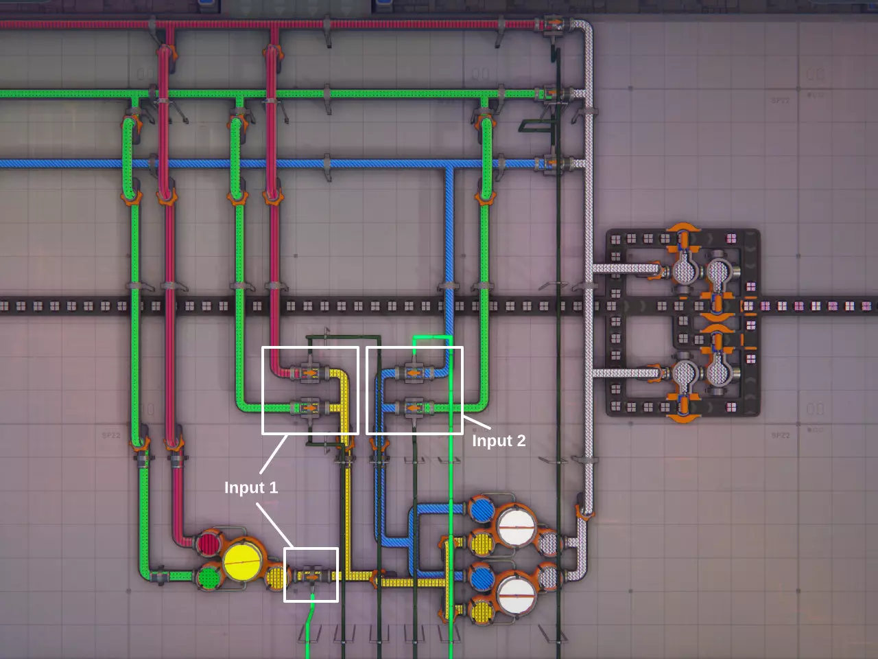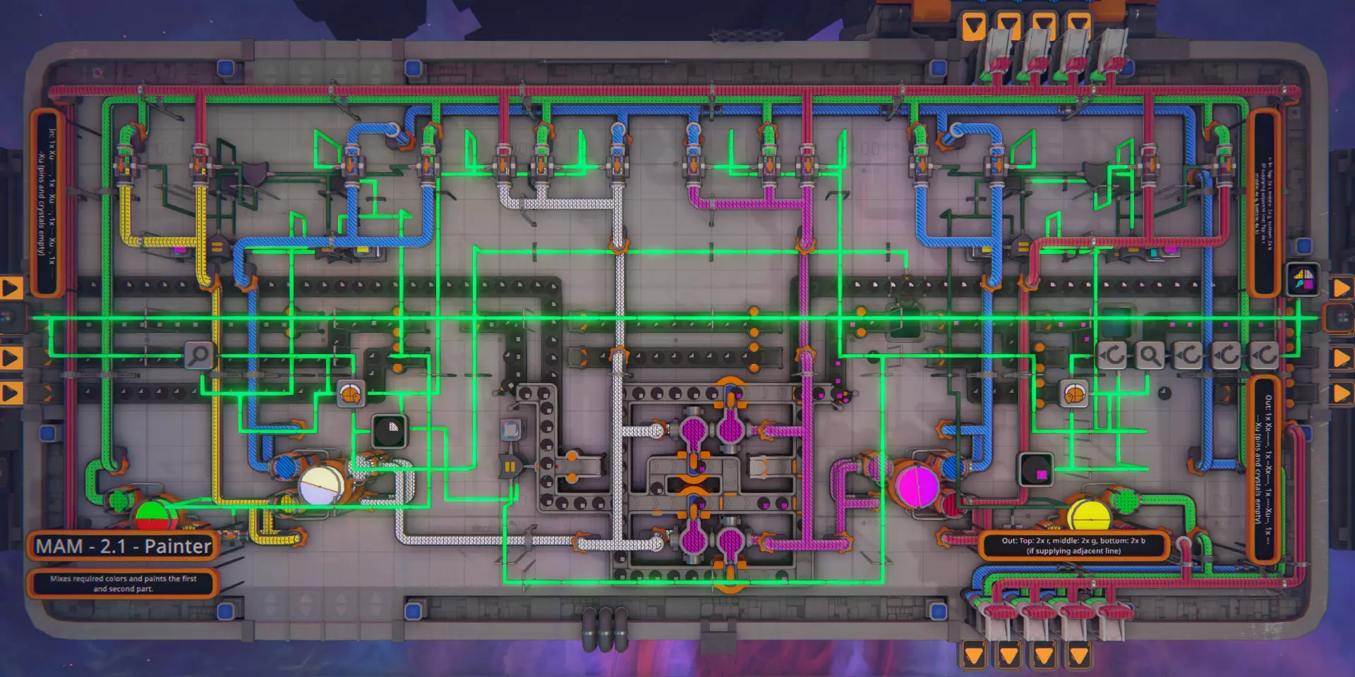 左侧图片展示了涂装模块中使用的管道设置。控制混合器输入需要五个管道闸门,另外还需要三个闸门来让原色也能流向涂装器。 如果颜色混合器的两个输入都提供相同的颜色,其输出也会是该颜色,因此通过混合器向涂装器供应原色的替代设置也是可行的。 需要注意的是,当输入改变时,如果颜色混合器的所有内部储罐都处于满状态,混合器将无法排空储罐,从而堵塞管道。由于无法像传送带那样将管道中的物料排到空间中,我发现防止管道堵塞的唯一可靠方法是用涂装器消耗掉剩余的颜色。随后将所有产生的颜色错误部件分拣出来并丢弃。