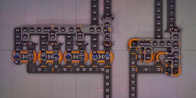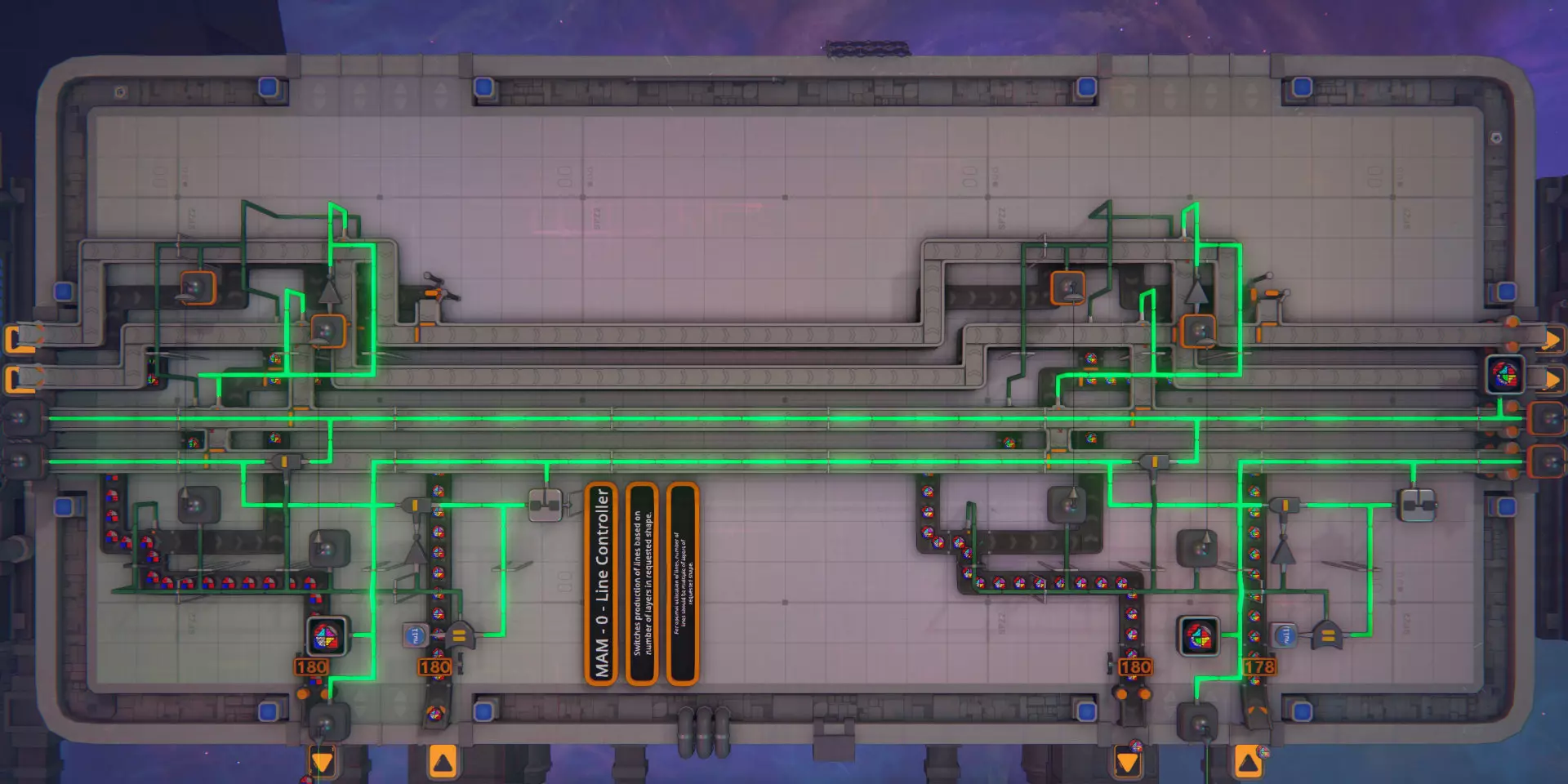 每个线路控制器管理两条生产线。它从前一个控制器接收两个线路信号。第一个是完整形状模板,第二个模板每次经过一条生产线时,其最上层会被移除并分配给该生产线。当第二个模板中不再有剩余层时,它将被第一个线路中的完整形状模板替换,此过程重复进行。 线路控制器从其两条生产线各接收一条形状传送带。它将未完成的形状路由到生产链中的下一条生产线,并将成品放置到出口传送带上。它可以处理8条成品形状传送带。 子控制器(可选)