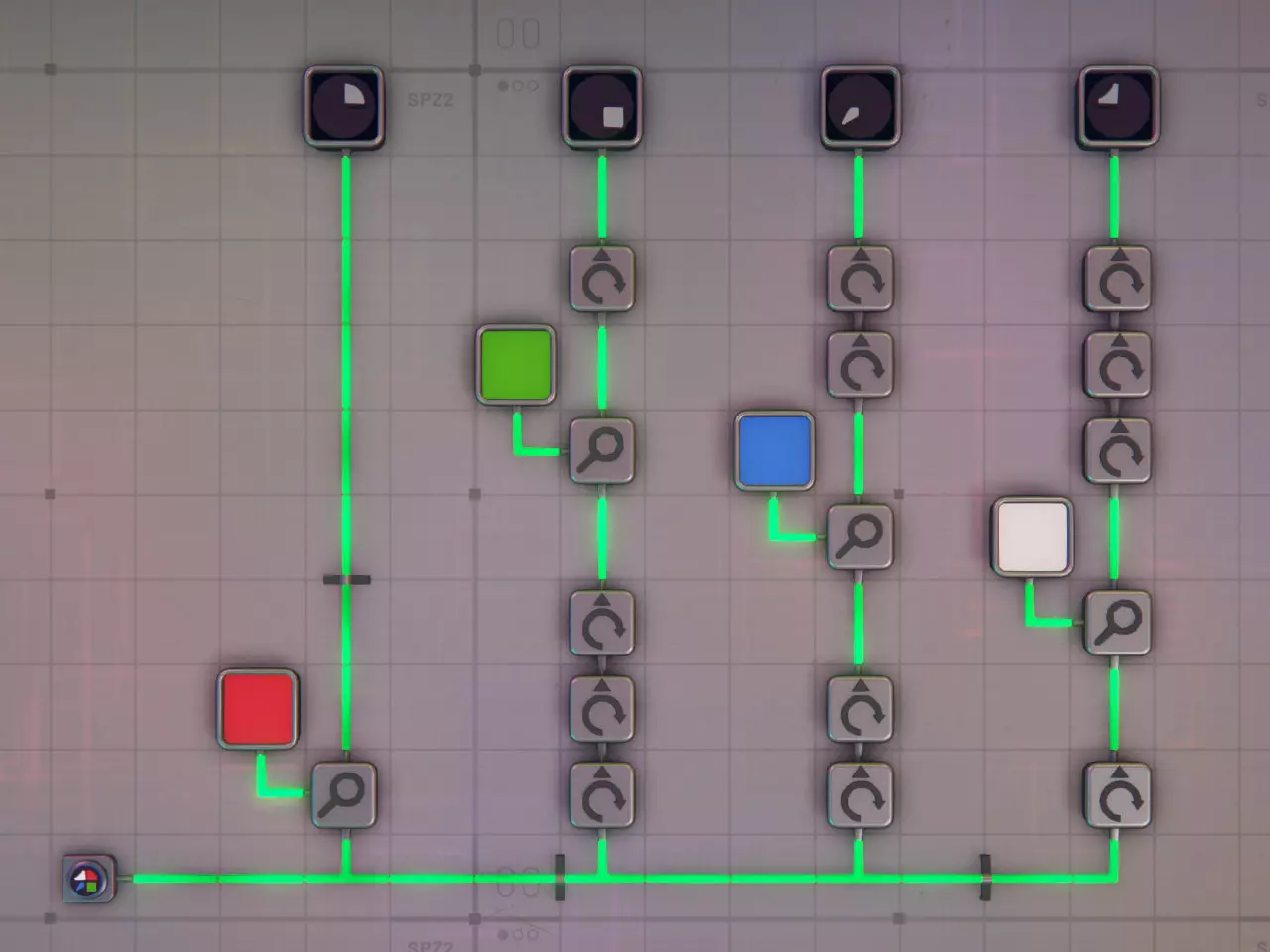 下一步是对部件进行涂装。由于其尺寸,涂装模块被拆分为两个1x2的平台。每个平台可将四个部件中的两个涂成七种可用颜色中的任意一种。 基础色(红、绿、蓝)从侧面输入。每个涂装平台每种基础色需要2个输入(如果要向相邻的生产线提供基础色,则需要4个)。颜色可根据需要进行混合。每个部件可以被涂成不同的颜色。 一个线路信号提供一层形状模板,用于确定部件的涂装颜色。该线路信号会被中继到切割模块。 涂装模块工作原理:颜色混合器