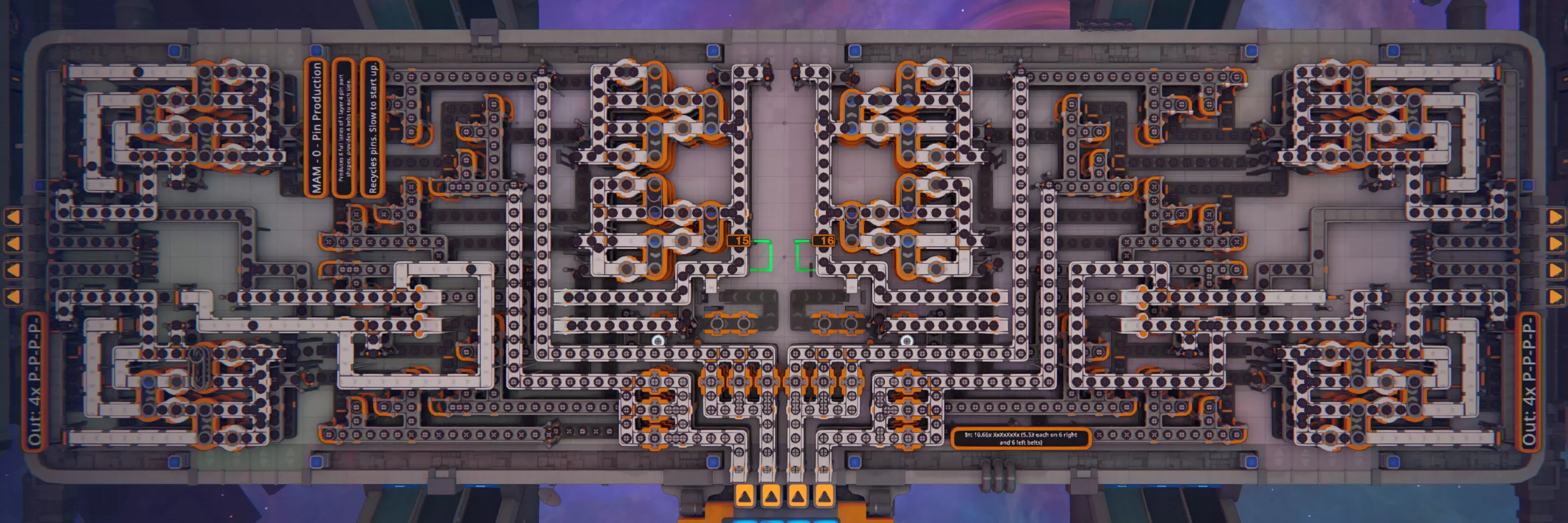 这是唯一的通知支持模块。它可安装在1x3的平台上,配备12条输入传送带,能够接收任何由四个部分组成的单层形状。该模块会生成8条满载单层全销形状“P-P-P-P-”的传送带,并从两侧各输出4条。 其生成销形状的过程如下:向一个形状添加销,直至超过层数限制,此时形状的最上层部分会被移除。最终得到一个仅由销组成的4层形状“P-P-P-P-:P-P-P-P-:P-P-P-P-:P-P-P-P-”,随后该形状会被切割成四个部分“P-------:P-------:P-------:P-------”。 另一种不同的形状会通过单个销推送器,在销层上方形成某种随机形状,然后堆叠到前一步骤生成的某个销塔顶部。最终形成的形状再次超出层数限制,原始形状被删除,剩下的三个销钉落到最底层,形成一个带有一个销钉塔和三个单个销钉的形状【P-P-P-P-:P-------:P-------:P-------】。 此形状通过一组交换器处理后,生成三个【P-P-P-P-】形状和一个【P-P-P-P-:P-P-P-P-:P-P-P-P-:P-P-P-P-】形状。前者被输送至生产线,后者则回收用于下一批次生产。 这种销钉生成器能将4部分的输入形状按4:3的比例转换为4个销钉形状。若输入形状的部件较少,其转换比例会更低。 3.2. 分配器