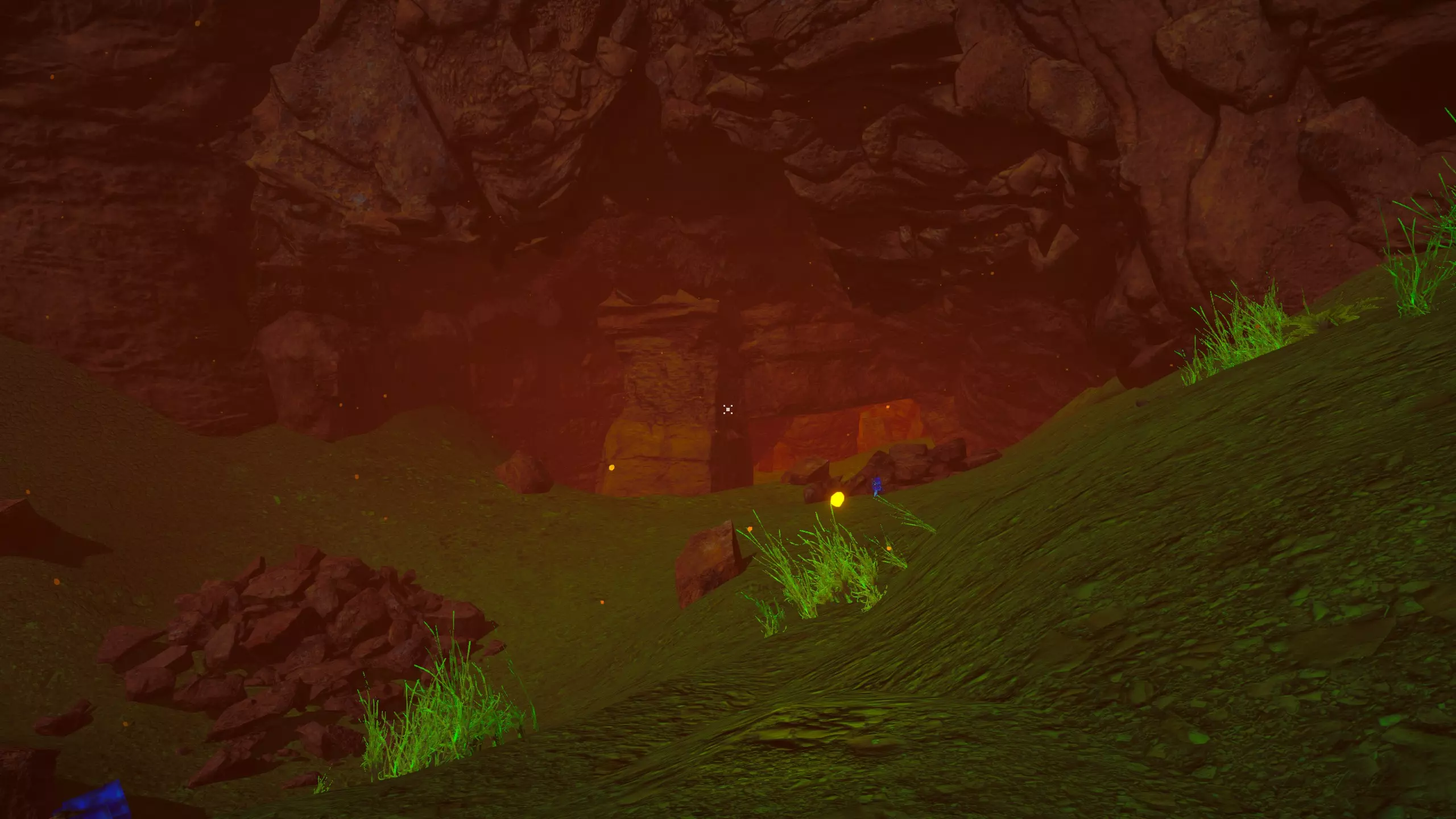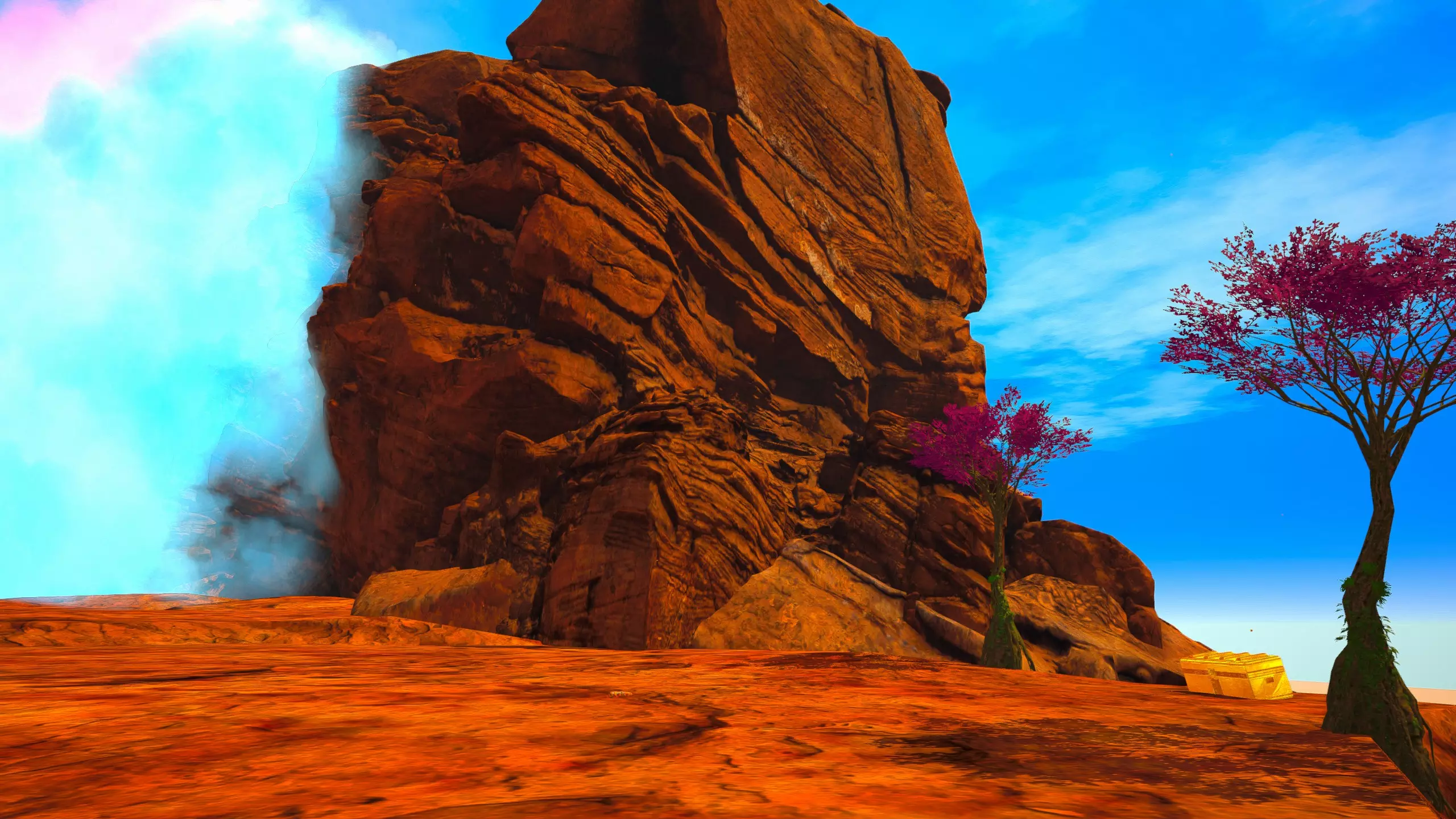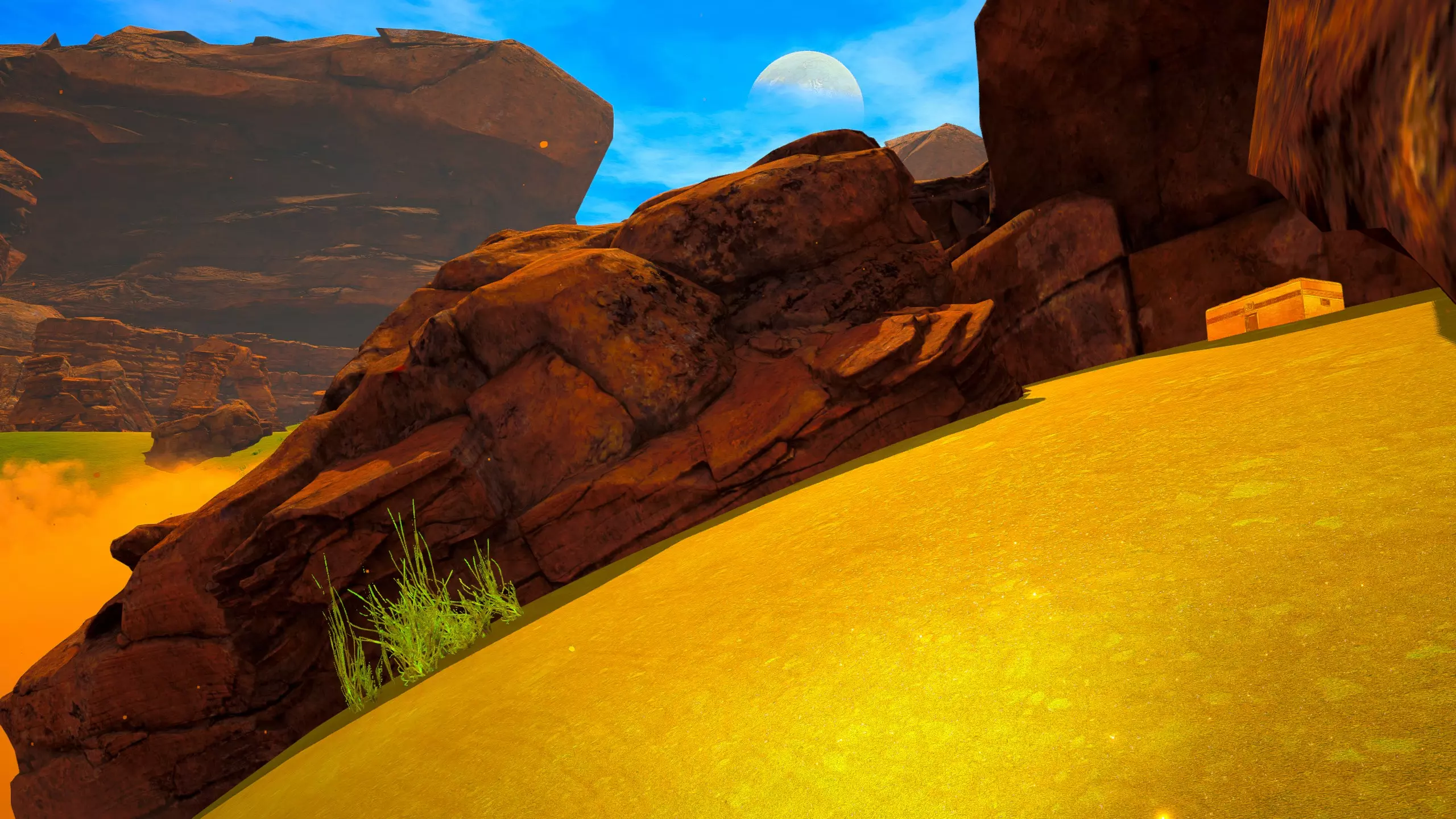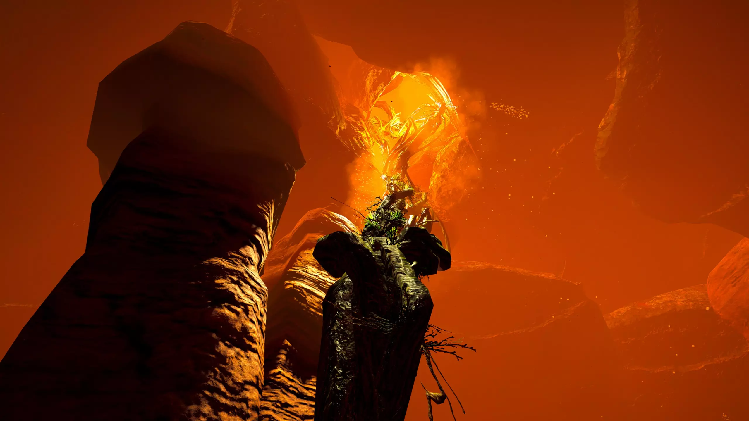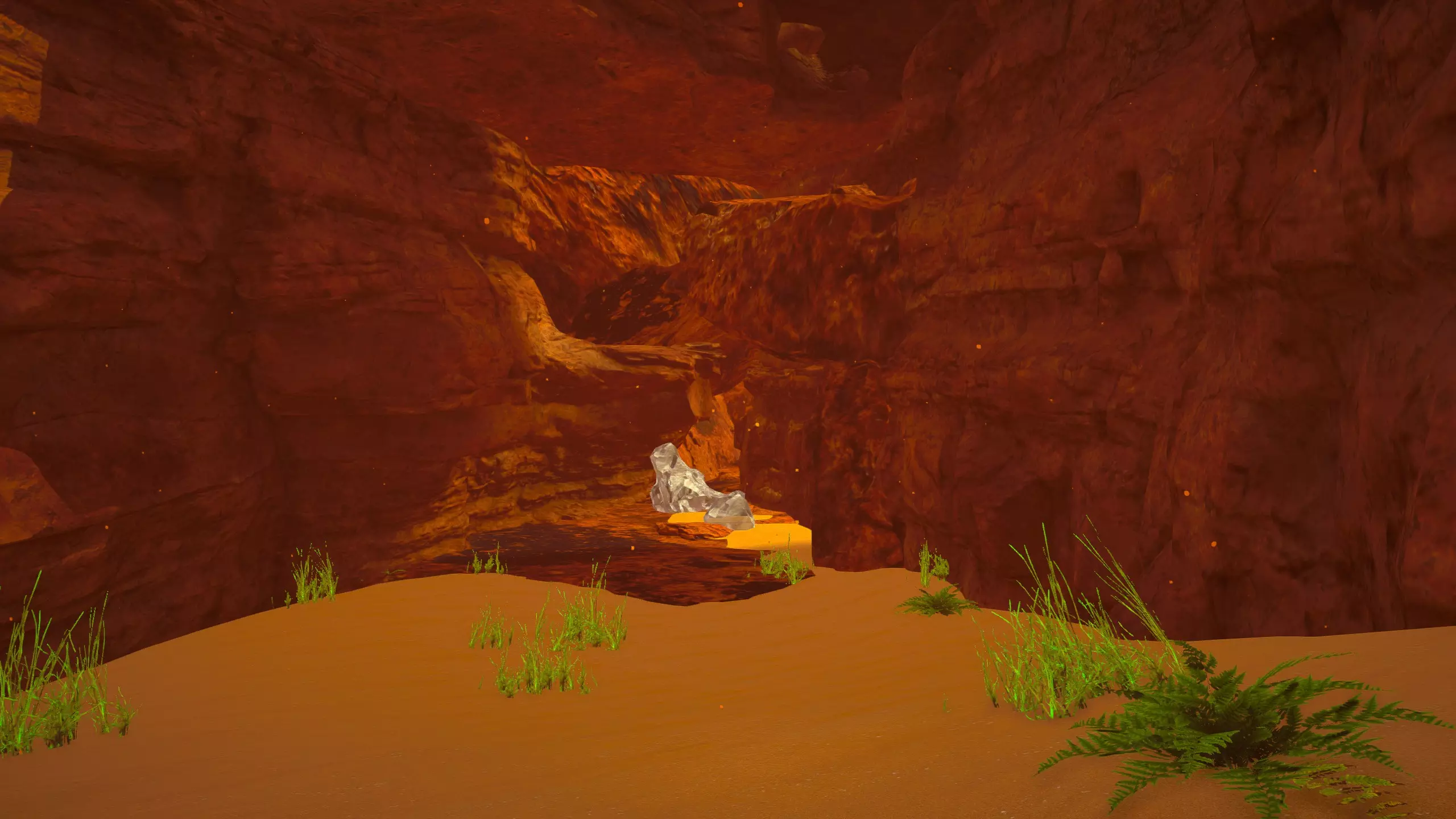 关于该区域的说明: 藤蔓会生长到……石林的顶部?(如果是峡谷中水流形成的,我不确定它的具体名称) 【注意】你可以攀爬藤蔓向上,但向下攀爬会/可能损害你的生命值/饱食度。 你可以在石林顶部采摘花朵。 沙漠 残骸