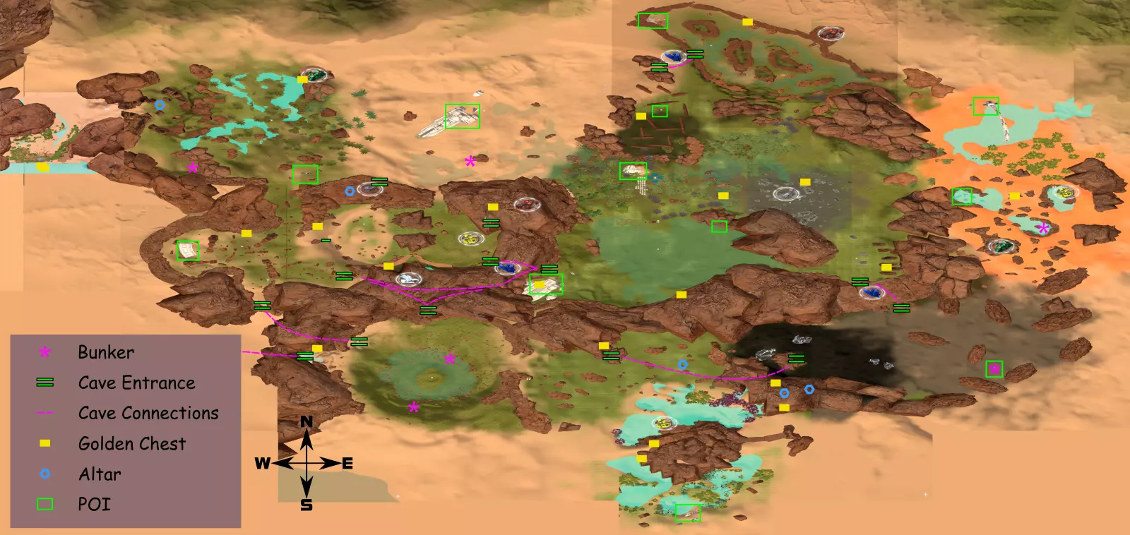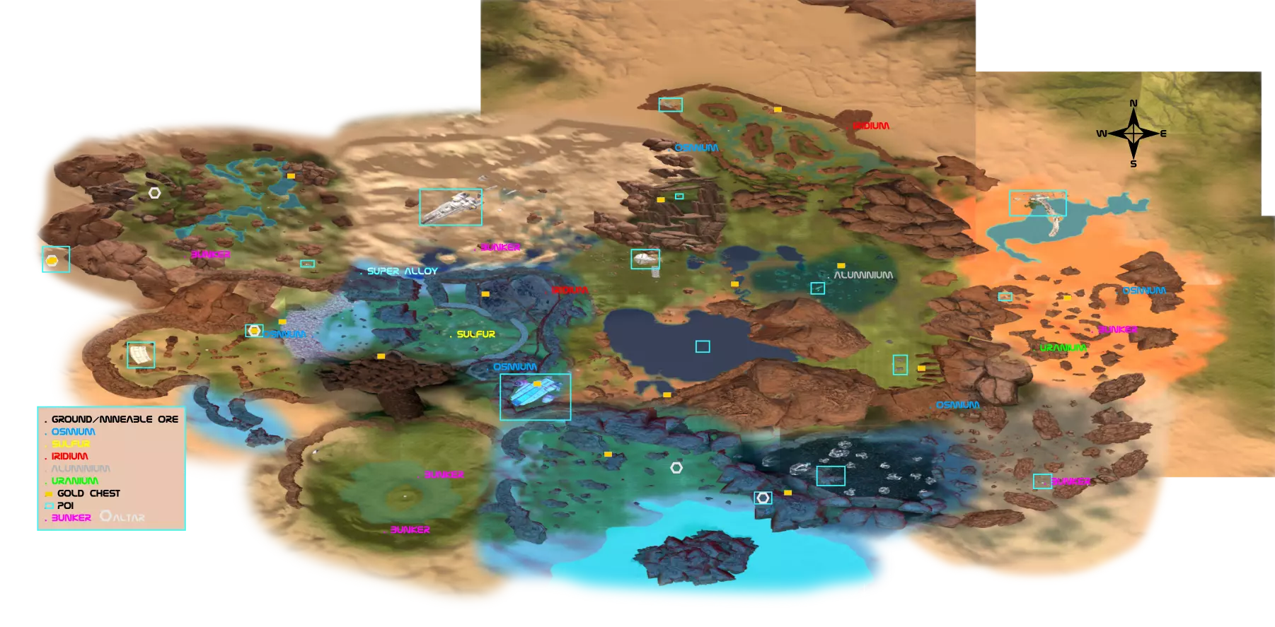 出于情感原因保留了这些内容…… 兴趣点位置(含剧透) 首先,如果你不喜欢剧透,请止步于此。 本内容并不全面,且很可能会因游戏更新或我尝试使其更完善/准确而发生变化……目前的标准相当低。 当前包含: 21个黄金宝箱位置 14处残骸(包括起始位置) 6个幸存者地堡 一个罗盘玫瑰 各种资源/采矿地点 洞穴入口及其连接 不包含: 蓝色宝箱 芯片 超过75%的准确率 生命、宇宙及一切的答案。
