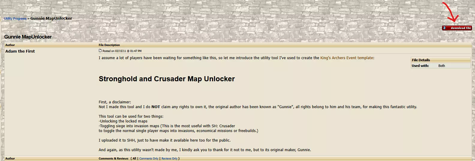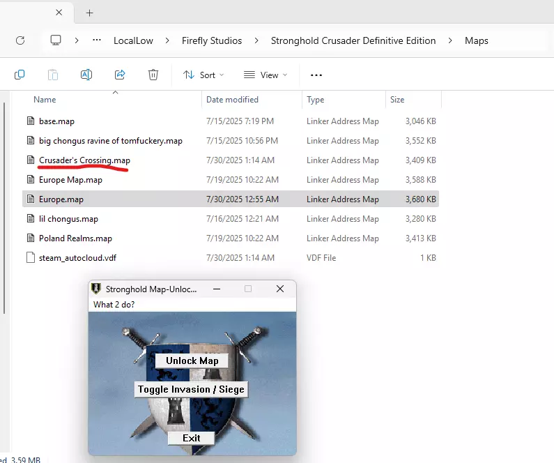 然后将该.map文件复制到用户的要塞目录地图文件夹中:C: Users User AppData LocalLow Firefly Studios Stronghold Crusader Definitive Edition Maps。下载并使用Gunnies Map Unlocker,这是一款旧版十字军地图解锁工具,可用于解锁地图以进行编辑和围攻切换。