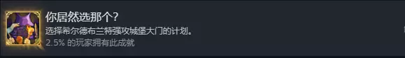 五个路线成就之一,没有剧情,探索到等级直接去大门打五波敌人。在选择这一项看完剧情之后就会跳成就,懒得打可以不继续打。 (无论选哪个格丽泽尔都会嫌这个计划不如找个巨魔商量,而且说要自己去阻止也不知道哪去了,要等之后的更新剧本才能知道了吧)