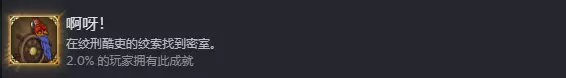在燃烧森林会刷新名为银蛇的怪物(刷新后很快会消失),其初始生命值为99,双甲值为99。进入战斗后,该怪物会直接逃走。通过伏击进入战斗并使用穿甲武器将其击杀,即可获得钥匙,该钥匙用于开启最后矿井中的上锁房间。另外本章各地会出现滑头海盗,处理方式相同,击杀后可获得海盗藏身处的钥匙,从而拿到一些额外补给。 除了以上成就外,本章最后的矿井副本左侧海域可找到鱼人斗技场,击败里面的土鳟后它会加入,同时完成解锁佣兵【陆地行者】的前置条件。 在本章偏左侧山地区域会发现流浪汉的囚车,解救后可在学识商店解锁流浪汉角色。 第四章:绞刑酷吏的绞索 挑战目标: 失踪的海盗:在女王的迷宫中救出约翰斯格雷夫。 打开牢房的钥匙位于海上的七级海蚀洞穴中,目前不清楚七级洞穴的位置是固定还是随机。救出海盗后他会加入,这是解锁佣兵约翰斯格雷夫的前置条件。 收复海洋:杀死50只海人。 海人在整个地图中分布广泛,若探索过所有海蚀洞穴,数量应该足够。 赶时间:在50轮内完成冒险。