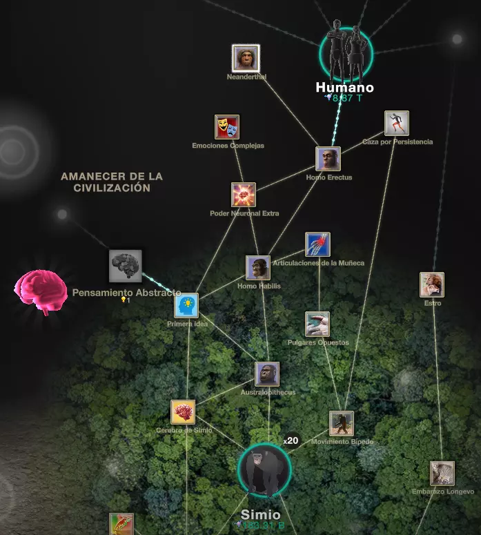 获得被动生产升级后,我们将能够朝着巨型大脑前进。点击巨型大脑会获得【想法】,这将是进化分支此部分的新货币。顺便一提,该分支会与熵进化分支结合生成【元比特】,这是一种稍后会遇到的货币,对于游戏的后续进度至关重要。我们还可以继续在熵分支中推进,但需要先获得人类才能继续【想法】进化分支的进度。