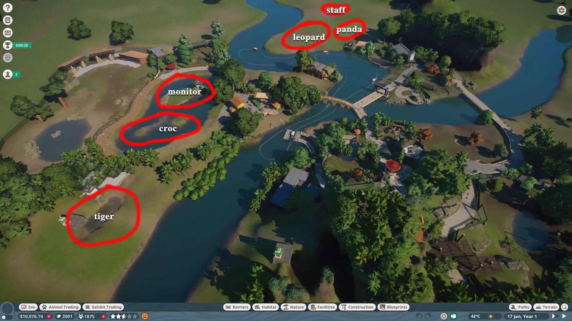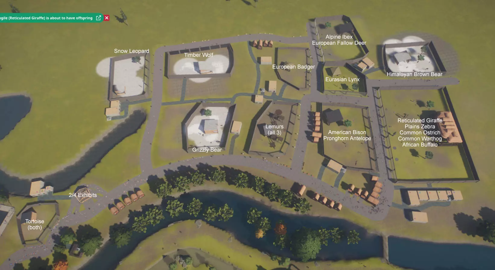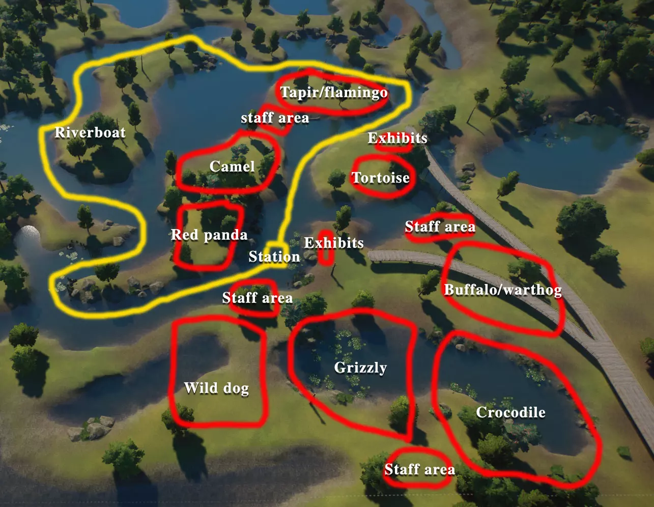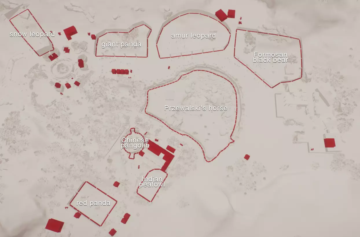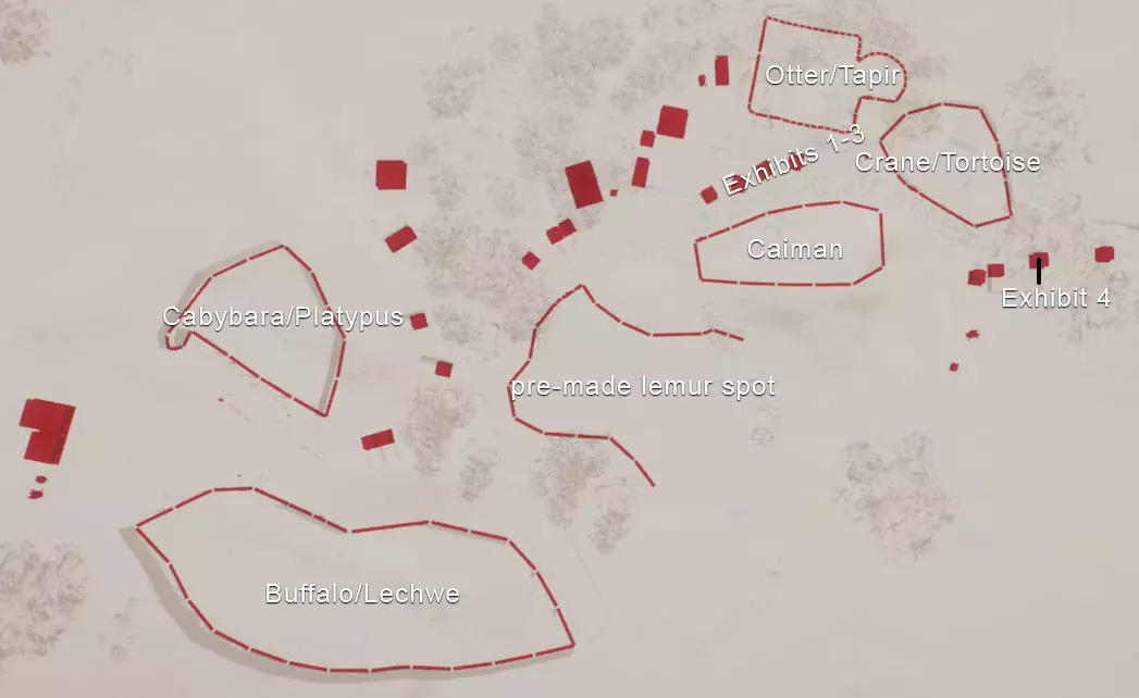 初始动物: 无,但随着时间推移,你将获得以下9种动物作为奖励: 奖励动物: - 3只丹顶鹤(1只雄性,2只雌性) - 1只中美貘(雌性) - 4只黑白领狐猴(1只雄性,3只雌性) - 1只水豚(雄性) - 3只尼罗泽羚(雌性) - 2只眼镜凯门鳄(雄性) - 1只野水牛(雄性) - 6只亚洲小爪水獭(雄性) - 2只幼年加拉帕戈斯象龟(1只雌性,1只雄性) *你无需购买不同物种,但可能需要为雄性动物搭配雌性。在“狂野水域”展区,你需要更多动物来满足它们的社交需求,但其余动物数量足以支持3倍速游玩(我损失了一只水獭,但那可能是我购买的雌性水獭之一——我当时没太注意),不过这可能取决于你放置它们的顺序。准备一对繁殖个体总是没错的。如果使用陆龟,你需要一只成年个体。你只需放置9只这类物种。 更新:感谢@BunnyRanch提醒我需要更新奖励动物。现已完成! 注意事项: - 在此关卡中无法编辑地形。蓝图将无法使用。 - 在预制的水獭围栏中放置一个水处理设施(随着你扩建,你将需要更多)。 - 雇佣员工(你一开始只有一个小贩)。- 至少将通往贸易中心区域的部分路径改为员工专用,以防止游客靠近建筑物。 - 删除入口附近的电力设施、装饰物品以及通往那里的路径。你不需要这些,而且还能收回一些资金。 - 可以忽略工坊警报,你不需要工坊。 - 将水獭放入预设的栖息地。之后你会在这里添加貘(陆地面积略小,但不会影响福利要求)。 - 获取一些展示动物并全部放置好。 - 获得其他动物后再进行放置。鹤和陆龟可以共享一个栖息地。鸭嘴兽和水豚可以共享。水牛和驴羚可以共享。给你的陆龟设置请勿打扰标识(即使没有单向玻璃,它们仍会有一定压力,但这不会长期影响你达成金牌目标)。 - 放置每只动物时,同时放置捐赠箱、教育标识和扬声器。当我有了更多资金后,我开始安排大量教育人员,这就满足了教育要求,无需其他操作。 - 设置食品、饮料摊位和商店来赚钱并取悦游客。 - 我最终不需要任何营销手段就能达到游客数量或星级目标。 - 无需进行研究。你已解锁足够的丰容设施来满足动物福利需求,且教育目标也能在没有研究的情况下达成。有趣的是,如果你放置饮水器,它们仍然会计入丰容值,即使水位很浅也会算,所以记得放置。 - 狐猴有预设区域,但由于它们是高压力动物,我没费心放置它们。 - 这一关很简单:一次就过,还有很多剩余时间(大概20分钟)。 - 有个要点需要补充:检查狐猴和水獭栖息地的岩石,它们可能是逃跑路径,需要移除一些。 我的布局:
