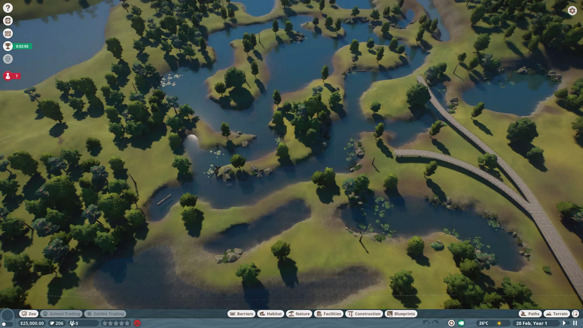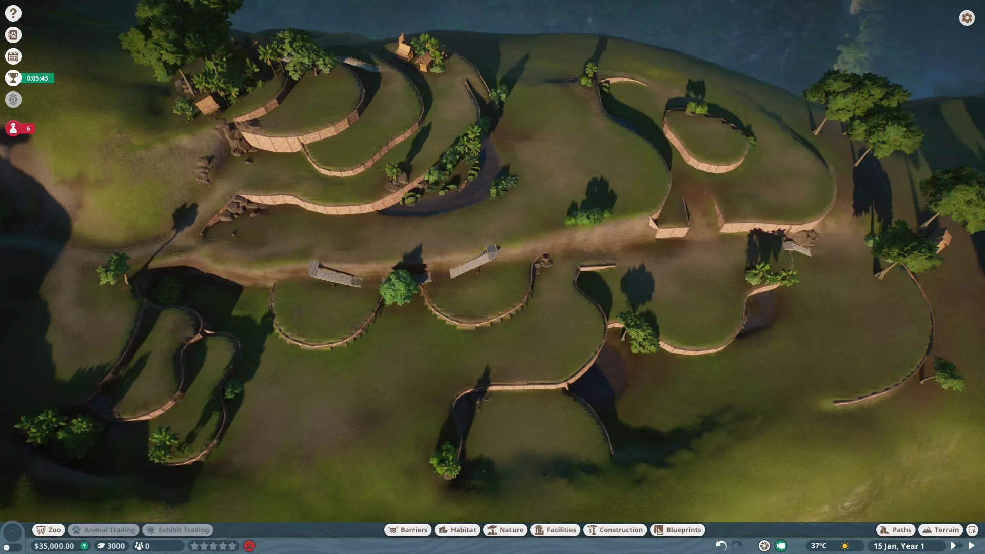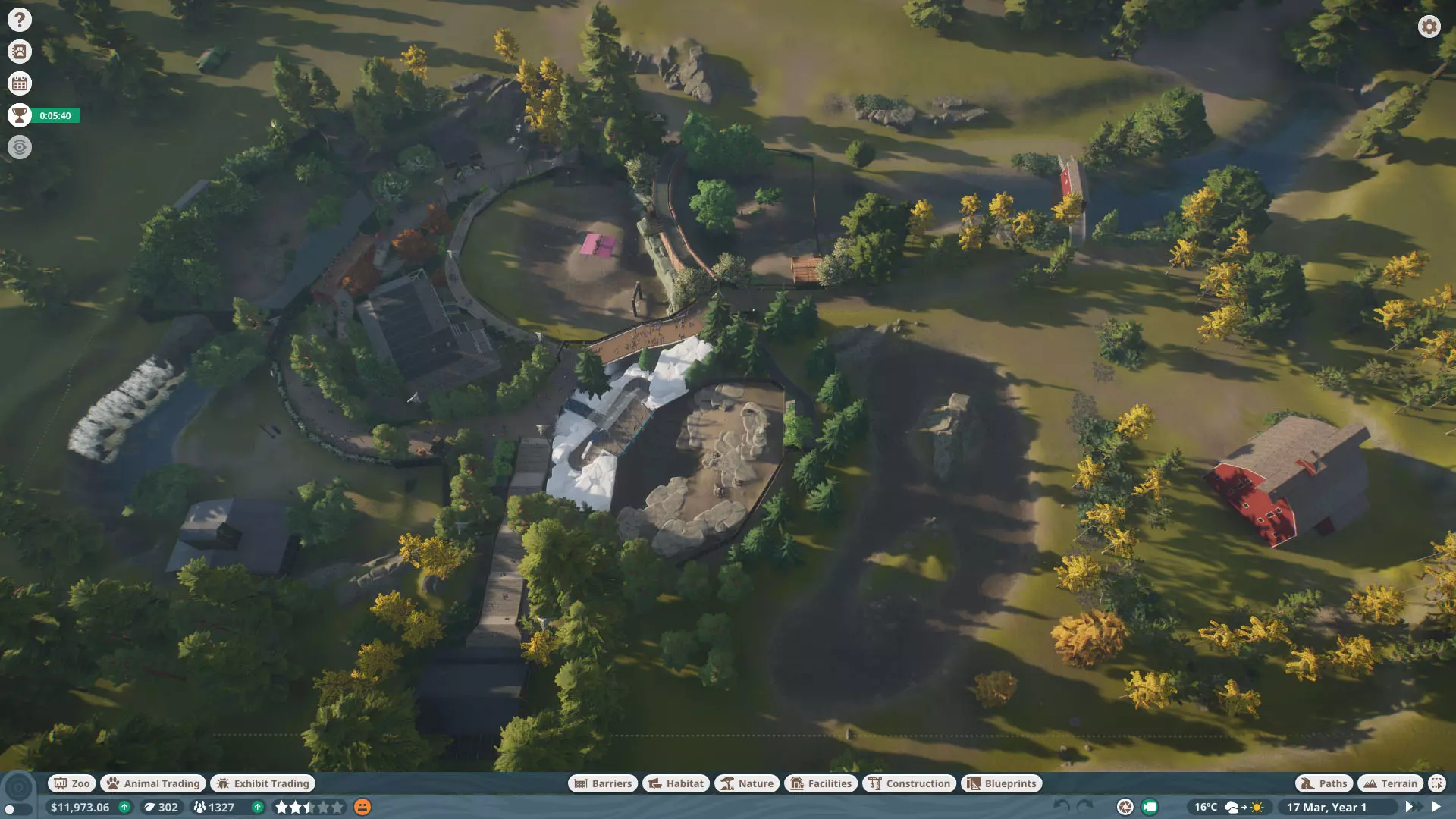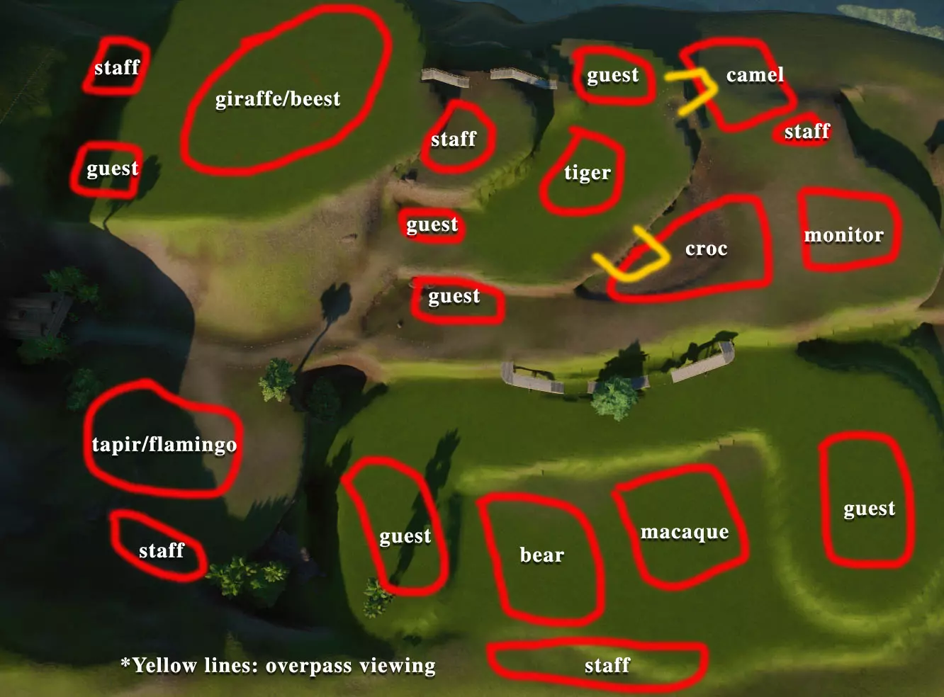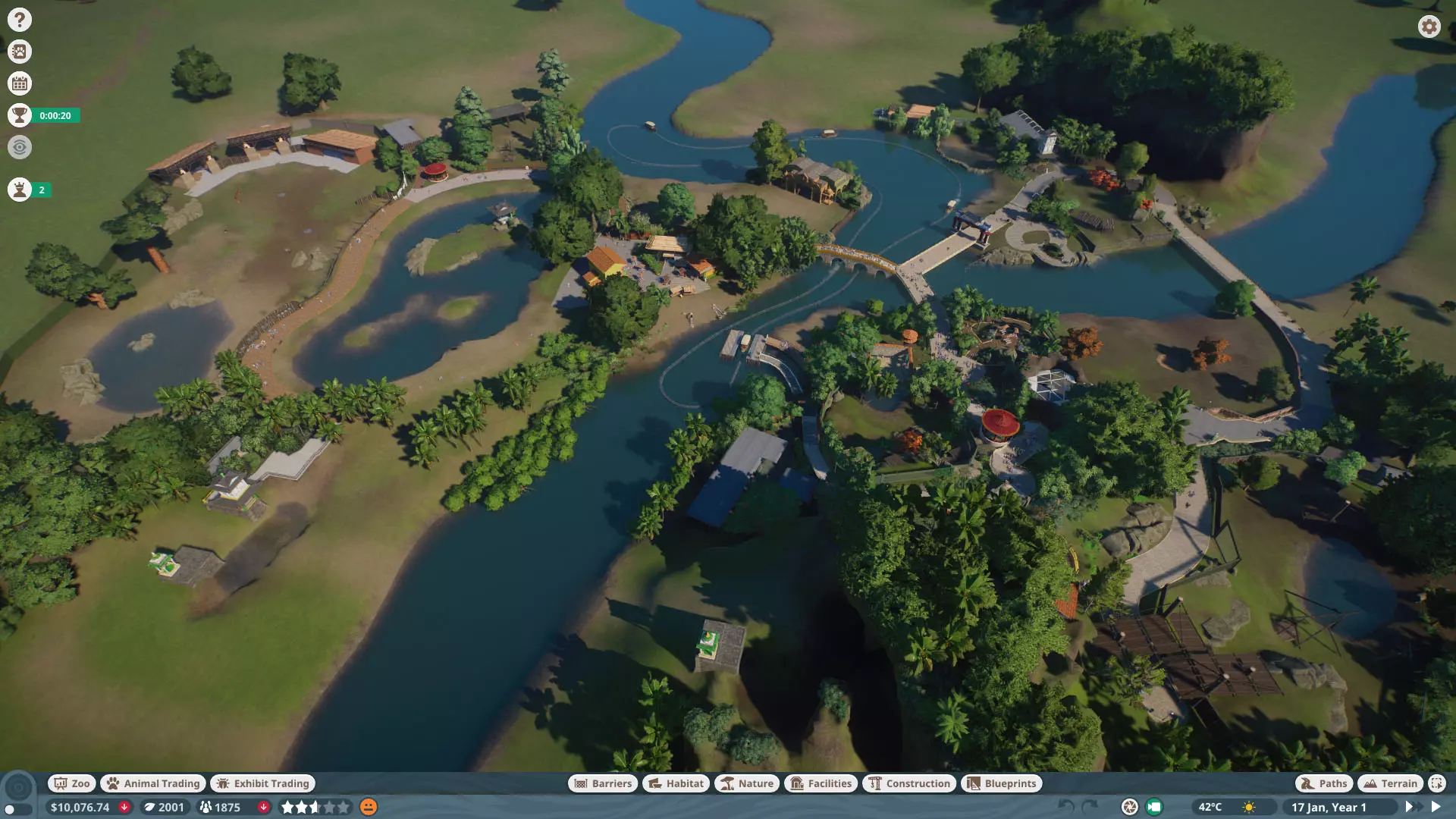 初始动物: 无,但随着时间推移,你将获得以下9种动物作为奖励: 奖励动物: - 3只丹顶鹤(1只雄性,2只雌性) - 1只中美貘(雌性) - 4只黑白领狐猴(1只雄性,3只雌性) - 1只水豚(雄性) - 3只尼罗泽羚(雌性) - 2只眼镜凯门鳄(雄性) - 1只野水牛(雄性) - 6只亚洲小爪水獭(雄性) - 2只幼年加拉帕戈斯象龟(1只雌性,1只雄性) *你无需购买不同物种,但可能需要为雄性动物搭配雌性。在“狂野水域”展区,你需要更多动物来满足它们的社交需求,但其余动物数量足以支持3倍速游玩(我损失了一只水獭,但那可能是我购买的雌性水獭之一——我当时没太注意),不过这可能取决于你放置它们的顺序。准备一对繁殖个体总是没错的。如果使用陆龟,你需要一只成年个体。你只需放置9只这类物种。 更新:感谢@BunnyRanch提醒我需要更新奖励动物。现已完成! 注意事项: - 在此关卡中无法编辑地形。蓝图将无法使用。 - 在预制的水獭围栏中放置一个水处理设施(随着你扩建,你将需要更多)。 - 雇佣员工(你一开始只有一个小贩)。- 至少将通往贸易中心区域的部分路径改为员工专用,以防止游客靠近建筑物。 - 删除入口附近的电力设施、装饰物品以及通往那里的路径。你不需要这些,而且还能收回一些资金。 - 可以忽略工坊警报,你不需要工坊。 - 将水獭放入预设的栖息地。之后你会在这里添加貘(陆地面积略小,但不会影响福利要求)。 - 获取一些展示动物并全部放置好。 - 获得其他动物后再进行放置。鹤和陆龟可以共享一个栖息地。鸭嘴兽和水豚可以共享。水牛和驴羚可以共享。给你的陆龟设置请勿打扰标识(即使没有单向玻璃,它们仍会有一定压力,但这不会长期影响你达成金牌目标)。 - 放置每只动物时,同时放置捐赠箱、教育标识和扬声器。当我有了更多资金后,我开始安排大量教育人员,这就满足了教育要求,无需其他操作。 - 设置食品、饮料摊位和商店来赚钱并取悦游客。 - 我最终不需要任何营销手段就能达到游客数量或星级目标。 - 无需进行研究。你已解锁足够的丰容设施来满足动物福利需求,且教育目标也能在没有研究的情况下达成。有趣的是,如果你放置饮水器,它们仍然会计入丰容值,即使水位很浅也会算,所以记得放置。 - 狐猴有预设区域,但由于它们是高压力动物,我没费心放置它们。 - 这一关很简单:一次就过,还有很多剩余时间(大概20分钟)。 - 有个要点需要补充:检查狐猴和水獭栖息地的岩石,它们可能是逃跑路径,需要移除一些。 我的布局: