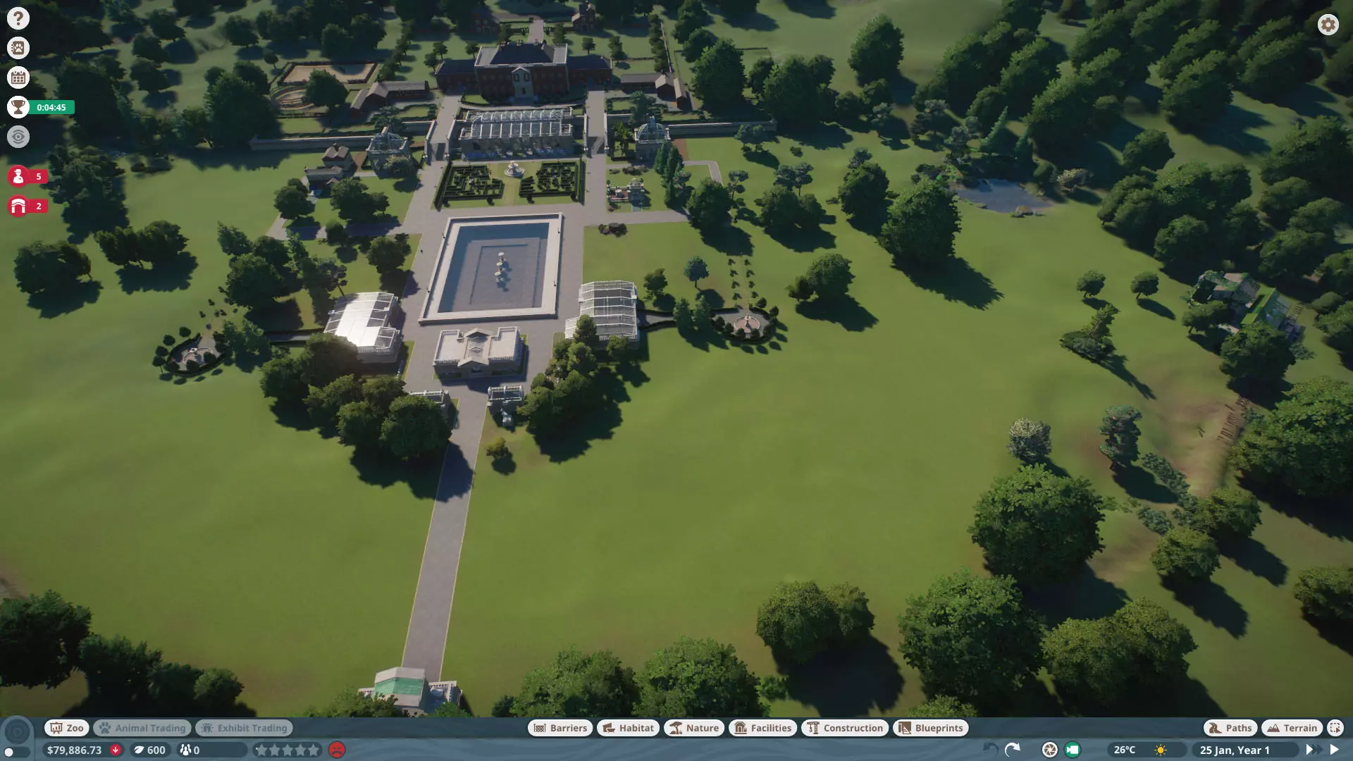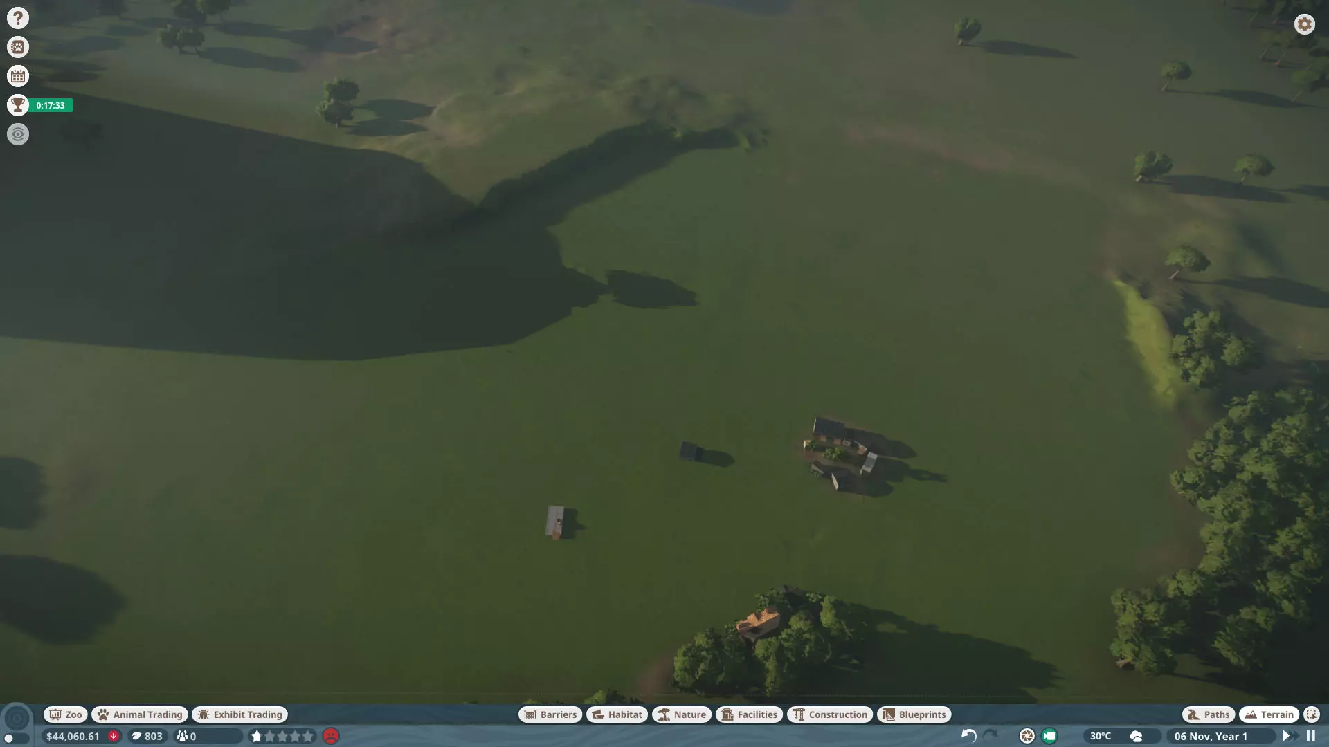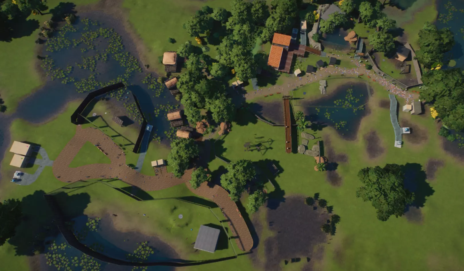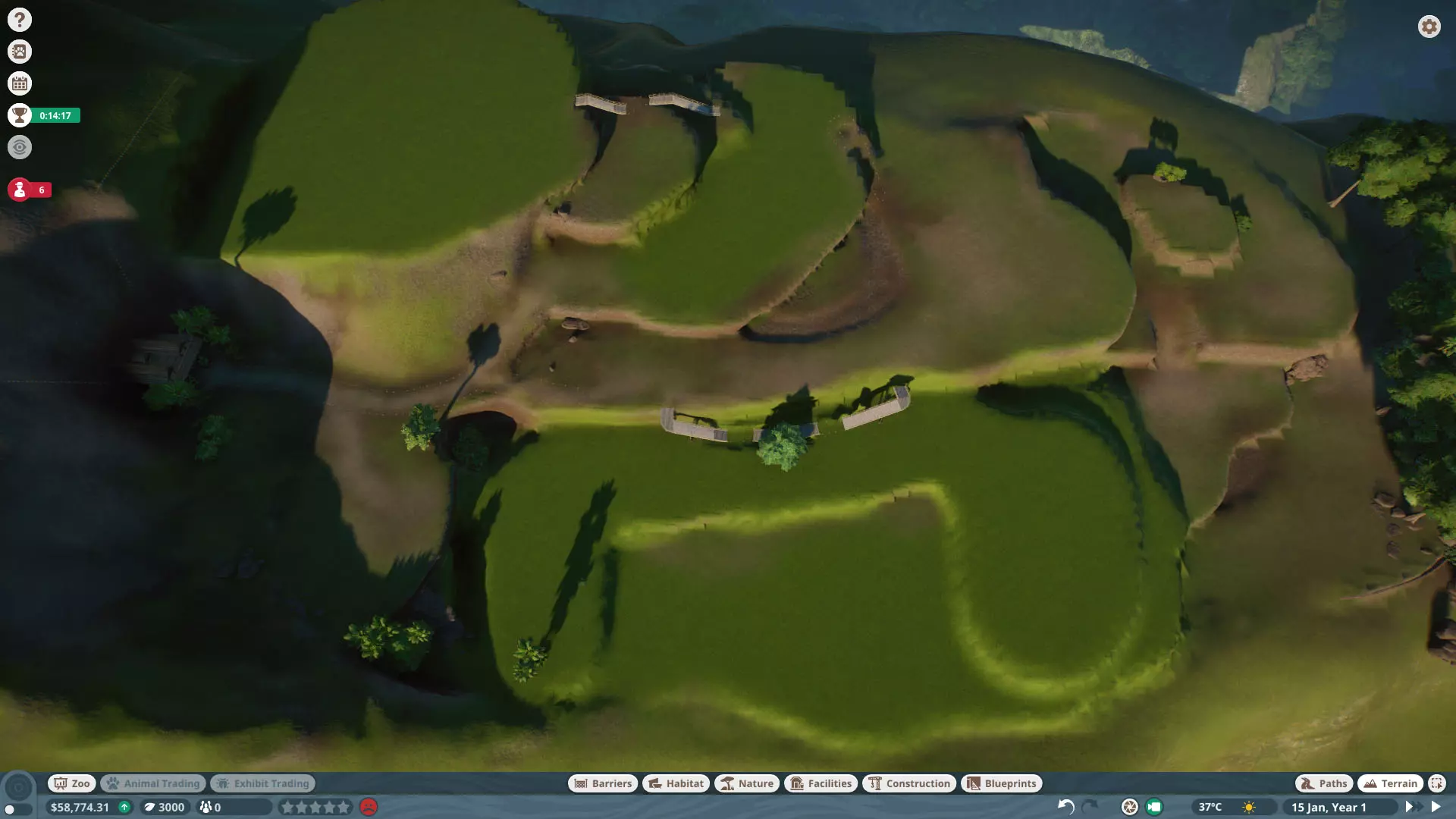 初始动物: 无,但随着时间推移,你将获得以下9种动物作为奖励: 奖励动物: - 3只丹顶鹤(1只雄性,2只雌性) - 1只中美貘(雌性) - 4只黑白领狐猴(1只雄性,3只雌性) - 1只水豚(雄性) - 3只尼罗泽羚(雌性) - 2只眼镜凯门鳄(雄性) - 1只野水牛(雄性) - 6只亚洲小爪水獭(雄性) - 2只幼年加拉帕戈斯象龟(1只雌性,1只雄性) *你无需购买不同物种,但可能需要为雄性动物搭配雌性。在“狂野水域”展区,你需要更多动物来满足它们的社交需求,但其余动物数量足以支持3倍速游玩(我损失了一只水獭,但那可能是我购买的雌性水獭之一——我当时没太注意),不过这可能取决于你放置它们的顺序。准备一对繁殖个体总是没错的。如果使用陆龟,你需要一只成年个体。你只需放置9只这类物种。 更新:感谢@BunnyRanch提醒我需要更新奖励动物。现已完成! 注意事项: - 在此关卡中无法编辑地形。蓝图将无法使用。 - 在预制的水獭围栏中放置一个水处理设施(随着你扩建,你将需要更多)。 - 雇佣员工(你一开始只有一个小贩)。- 至少将通往贸易中心区域的部分路径改为员工专用,以防止游客靠近建筑物。 - 删除入口附近的电力设施、装饰物品以及通往那里的路径。你不需要这些,而且还能收回一些资金。 - 可以忽略工坊警报,你不需要工坊。 - 将水獭放入预设的栖息地。之后你会在这里添加貘(陆地面积略小,但不会影响福利要求)。 - 获取一些展示动物并全部放置好。 - 获得其他动物后再进行放置。鹤和陆龟可以共享一个栖息地。鸭嘴兽和水豚可以共享。水牛和驴羚可以共享。给你的陆龟设置请勿打扰标识(即使没有单向玻璃,它们仍会有一定压力,但这不会长期影响你达成金牌目标)。 - 放置每只动物时,同时放置捐赠箱、教育标识和扬声器。当我有了更多资金后,我开始安排大量教育人员,这就满足了教育要求,无需其他操作。 - 设置食品、饮料摊位和商店来赚钱并取悦游客。 - 我最终不需要任何营销手段就能达到游客数量或星级目标。 - 无需进行研究。你已解锁足够的丰容设施来满足动物福利需求,且教育目标也能在没有研究的情况下达成。有趣的是,如果你放置饮水器,它们仍然会计入丰容值,即使水位很浅也会算,所以记得放置。 - 狐猴有预设区域,但由于它们是高压力动物,我没费心放置它们。 - 这一关很简单:一次就过,还有很多剩余时间(大概20分钟)。 - 有个要点需要补充:检查狐猴和水獭栖息地的岩石,它们可能是逃跑路径,需要移除一些。 我的布局: