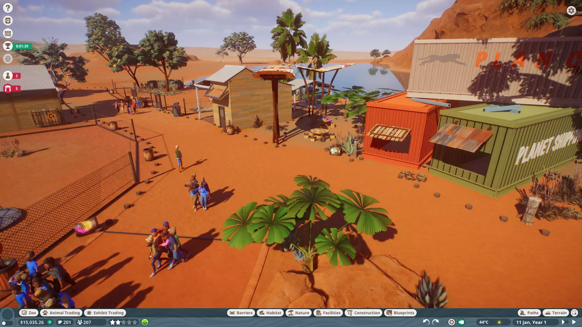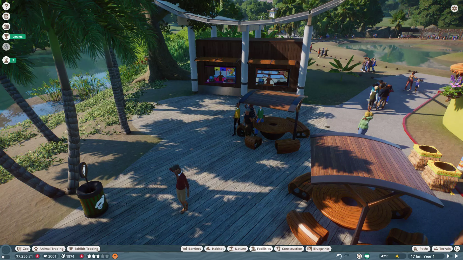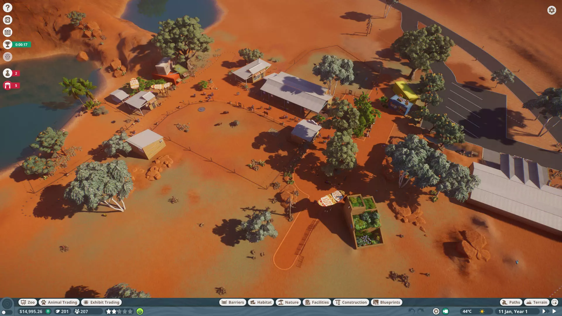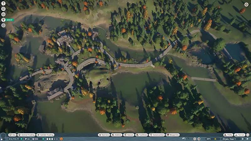 初始动物: -鹿豚 -熊狸 -普通鸵鸟(2只雄性) -豺 -河马 -亚洲象 -印度犀牛 -平原斑马 -马来貘 -长鼻猴 -网纹长颈鹿 -马来熊 注意事项: -此关卡无法编辑地形,蓝图功能不可用。 -许多雌性动物已启用避孕措施,需从动物园菜单中关闭。 -完成除骑乘设施外的所有目标后,请暂停游戏以防止进度丢失,然后完成骑乘设施。入口只需连接到出口路径即可,无需确保员工或游客能够实际到达。甚至无需放置电源,只需悬停放置即可完成关卡。 -在广场快速建造电力设施、商店和自动售货机。这里有可添加商店的位置以及可出售的物品。