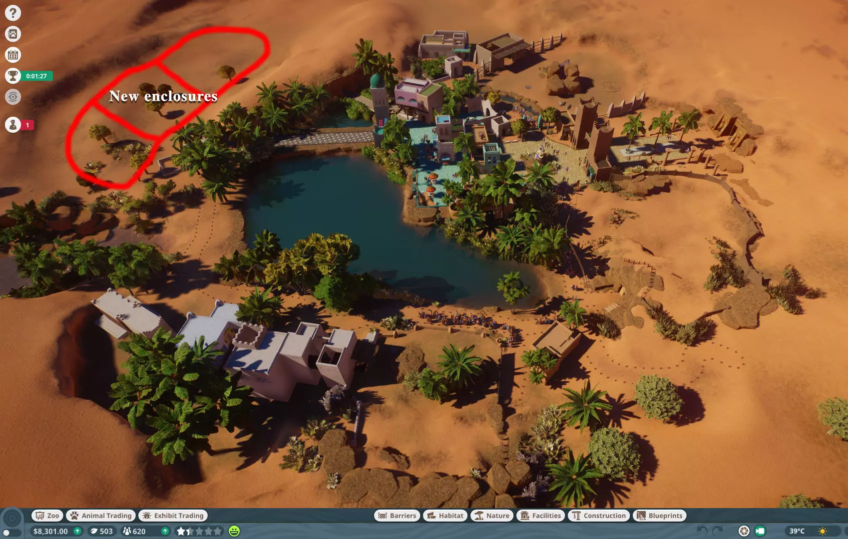 -移除一只雄性鸵鸟。引进一些雌性鸵鸟并将它们放入栖息地。 -商店、自动售货机、卫生间。大量饮料——天气很热。 -尽快还清贷款;开启3倍速,一旦商店开始运营,很快就会有足够的现金。 -非洲动物的围栏需要添加一个水质清洁器。 -这个关卡很简单:一次就通关了。 我的动物推荐: -孟加拉虎 -云豹 -恒河鳄 -尼罗巨蜥 -小熊猫 -湾鳄 我的布局: