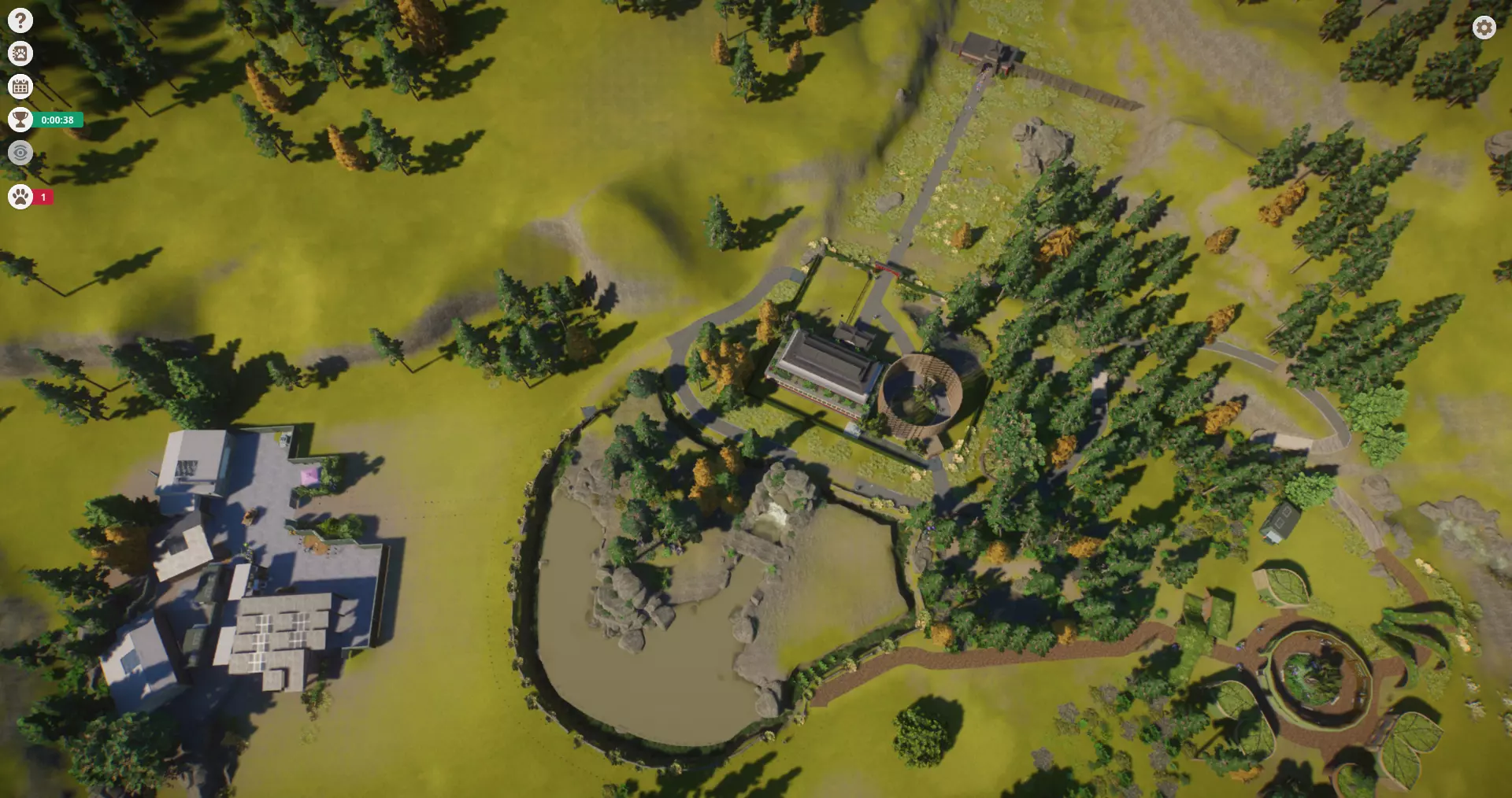 初始动物: - 中华穿山甲(2只雌性,2只雄性) - 印度孔雀(3只雌性,1只成年雄性,1只幼年雄性) - 美西螈(1只雌性) 动物推荐: - 说实话,这并不太重要,因为此场景可供选择的动物很少,而且你的许多选择都是食肉动物,因此需要单独饲养。 - 尽管如此,Planet Zoo讨论页面上的Jaggid Edje有一些不错的建议——我会在最后发布他们的信息(已获得许可)。 注意事项: - 【重要提示】由于某些原因,你可以在此场景中使用沙盒设置。就本指南而言,我本人并未触碰这些设置,但如果你想尝试调整设置来获取雕像,不妨一试。 - 调整你的美西螈设置,并为她找一个配偶。- 雇佣第二名机械师和兽医,让他们分别研究绿色能源和一种栖息地动物。密切关注兽医的等级,一旦达到2级就安排他们研究下一种动物。【注意:马需要3级才能研究】。 - 建造一个水处理设施,覆盖穿山甲栖息地和空的栖息地,以净化水源。 - 为现有的两种栖息地动物添加可用的丰容物品,孔雀需要补充水源。在它们的围栏内增设教育解说牌。在穿山甲栖息地放置“请勿打扰”和“请勿投喂”的标识,因为游客确实会走进它们的栖息地(不过令人惊讶的是,它们后来才出现压力问题,而标识解决了这个问题——通常它们会挑剔得多)。 - 将幼年孔雀送往贸易中心,并为成年孔雀启用避孕措施。它们繁殖速度极快,否则会引发健康问题。如果它们死了,就买新的。或者,如果你想留意幼崽何时长大,那就这样做,然后将另一只雄性作为你的第一次放生对象。 - 立即获取你的马匹并放置好进行研究。我把它们放在了已有的栖息地。记得捐赠和教育。 - 到处放置回收站(这能帮你获得CC,你会需要的)。 - 获取另一种动物(任何一种),并为其安置栖息地和教育设施。 - 我在所有四个栖息地都设置了讲解点,还额外雇佣了一些教育员,因为他们现在应该在行走时进行讲解。 - 在栖息地放置4个观景台,把这个任务从你的清单上划掉。 - 设置一些游客商店和自动取款机。- 一旦拥有风力发电,就替换掉发电机。可以继续研究太阳能,因为太阳能板可以放置在任何地方。 - 现在你应该有马和穿山甲可以放归野外了,可能还有第四种动物,这样做可以完成目标并获得一些保护币。继续放归动物以获取保护币和提升保护等级。 - 建造下一个包含捐赠和教育设施的4个栖息地。这样做通常能默认达成植物目标。 - 建造过程中顺便添加展示区,这是一种低成本的补充,有助于吸引游客和增加收入。 - 全程根据需要雇佣额外的员工。 - 这个关卡很简单:一次就通关了。 我的布局: