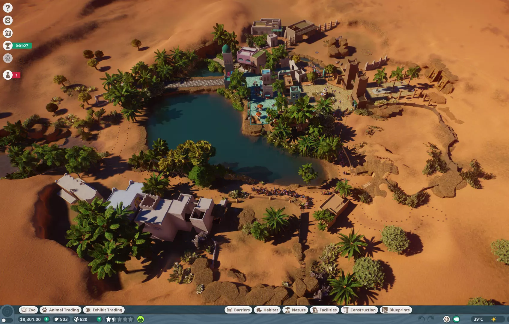 注意事项: - 拆除地图周围所有小屋和障碍物以获取资金。 - 游客会充分利用商店。 - 我在骆驼、老虎、鳄鱼和貘的区域设置了讲解点,要尽快完成这些。 - 进行更多营销活动来吸引游客并无坏处。 - 我从老虎开始,因为它们很有吸引力。研究老虎的相关内容,其中很多也适用于其他食肉动物。 - 接下来我添加了貘和火烈鸟,然后是鳄鱼、骆驼和巨蜥。 - 一开始你只能买得起一只长颈鹿,所以我在能买第二只时才把它们放在最后。 - 不需要单向玻璃,“请勿打扰”的标识就足以控制动物的压力。我的动物推荐: -双峰驼 -中美貘 -湾鳄 -大火烈鸟 -孟加拉虎 -黑尾牛羚 -喜马拉雅棕熊 -日本猕猴 -尼罗河巨蜥 -网纹长颈鹿 我的地形修改: