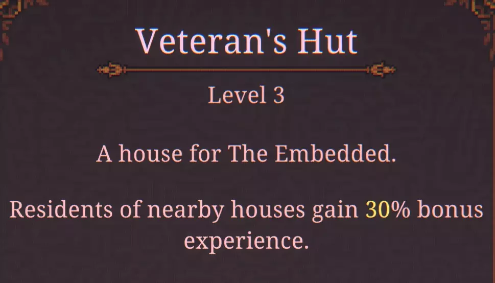 这里是所有围绕【老兵小屋】的角色建筑,可在游戏过程中获得最大经验值加成。
