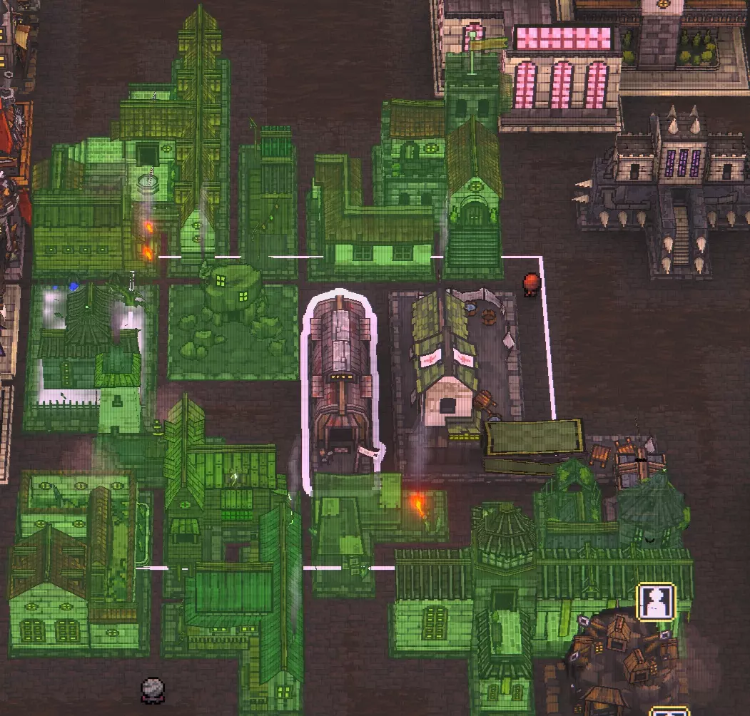 这里我们可以看到整体布局。 左侧的建筑已经全部升级到最高级,不再重要,所以可以放在一旁。 中间区域是金矿+无限属性建筑+居民住房。 右侧是木材、小麦和石料农场。 金矿布局