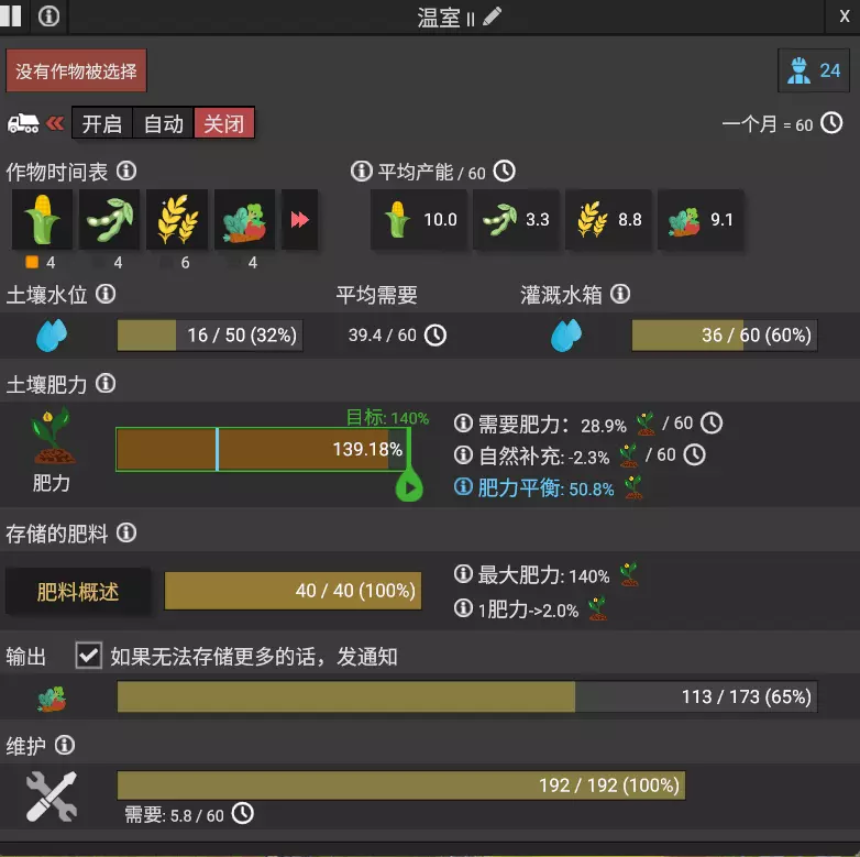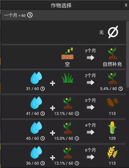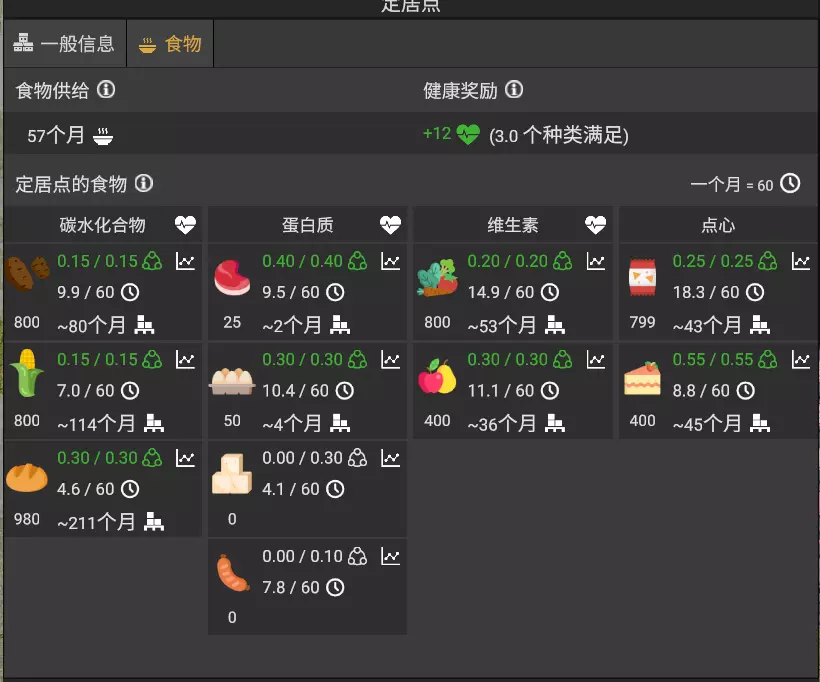 土壤肥力也是种植农作物的一个指标,可以分别看到种植该作物每月所需的肥力(百分比)、当前土壤的肥力以及土地每月自然补充的肥力。在不种植任何作物的情况下,土壤肥力最终会自然补充至100%。蓝线表示肥力平衡,即综合计算种植的作物后,在没有外来肥料的情况下,土壤肥力会自然收敛到的值。 解锁轮作后,可以通过选择土壤休耕来恢复肥力,或者消耗水种植绿肥(种植杂草然后翻到土里)来恢复肥力。但这并不意味着增加休耕或绿肥就一定会提高产量,系统会人性化地计算出当前种植策略带来的平均产能,你可以据此调整轮作表。同样从二级农场开始,自然轮作逐渐无法满足土壤肥力需求,需要玩家生产化肥。肥料分为有机肥料和化肥2(从化肥1生产化肥2非常简单,因此化肥1不计在内)。有机肥料由居民区产生的湿垃圾、过剩的农作物、处理生活污水得到的污泥生产而来,最高可提升土壤肥力至100%。由于居民产生的湿垃圾量不可能超过其消耗量,因此单独使用有机肥是不够的。化肥2由炼油工业产生的副产物生产得到,可以将土壤肥力提升到140%。 土壤肥力在高于100%时,自然补充为负数,因此需要不断提供化肥来维持肥力。 当没有大量剩余人口(只吃不干活)时,炼油工业生产的化肥整体是过剩的,不需要单独生产。 游戏中可以解锁各种食物。部分食物需要通过农作物二次加工获得。游戏中会解锁养鸡场,用于生产鸡肉和鸡蛋。满足居民的食物需求可获得凝聚力。当提供多种食物时,居民对每种单一食品的需求会减少,但需求总量保持不变。 满足基本食物需求每月可提供1凝聚力×住房等级加成。在此基础上,食物分为碳水化合物、维生素、蛋白质、点心四大类,满足每一类食物会额外提供对应的健康值。此外,提供每种单独的食物还会另外增加固定的凝聚力奖励: 食品类别 食物 凝聚力 碳水化合物 土豆 0.15 碳水化合物 玉米 0.15 碳水化合物 面包 0.30 蛋白质 肉 0.40 蛋 0.30 豆腐 0.30 香肠 0.10 维生素 蔬菜 0.20 水果 0.30 点心 零食 0.25 蛋糕 0.55 由于制作组的设计,食品需求和对应的生产配方比例相对契合。游戏中总共有十一种食品,因此你在中期需要:两台磨坊生产面粉,两台烘焙机生产蛋糕和面包,另一台磨坊生产食用油,一台食品加工机处理三个养鸡场生产的整鸡,两台食品加工机生产零食和豆腐,一台食品加工机生产香肠。